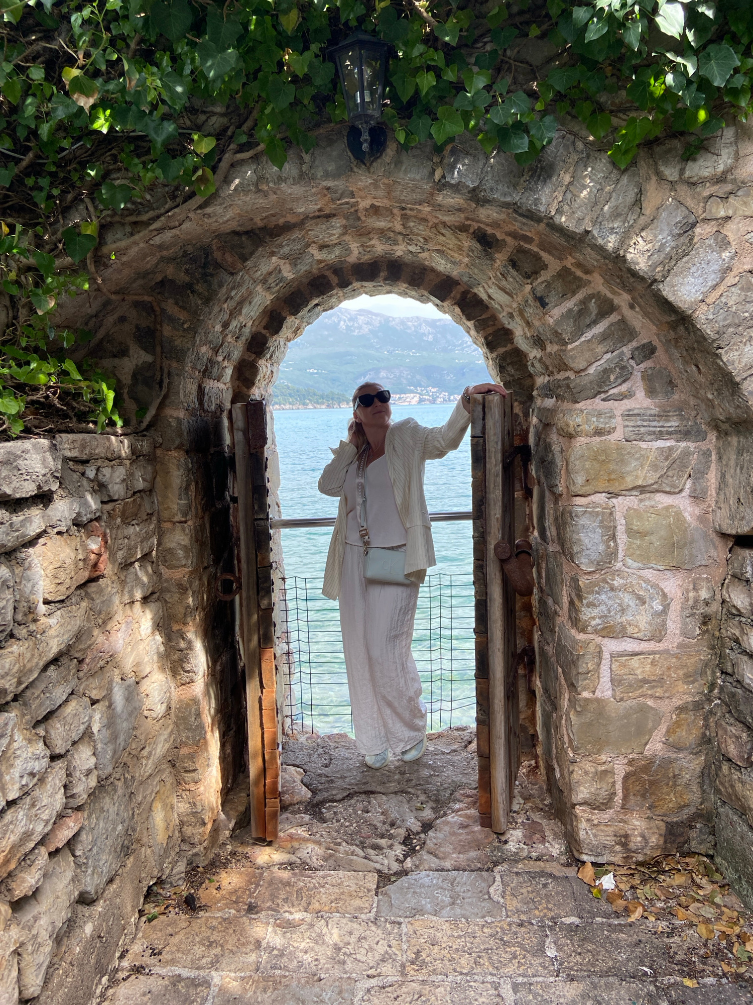 The image, rotated 90 degrees clockwise, captures a person standing within an ancient stone archway, looking out over a scenic coastal landscape. The setting appears to be a historic stone structure,…read more