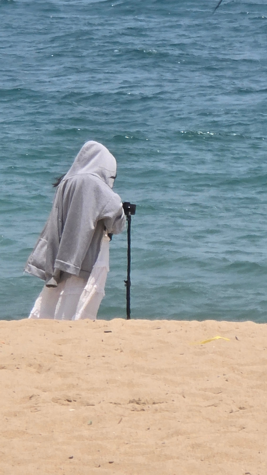 The photograph, taken at an outdoor location in Nha Trang, Vietnam, shows a person wearing a grey hooded sweatshirt and white dress standing near the edge where the sandy ground meets the blue water.…read more