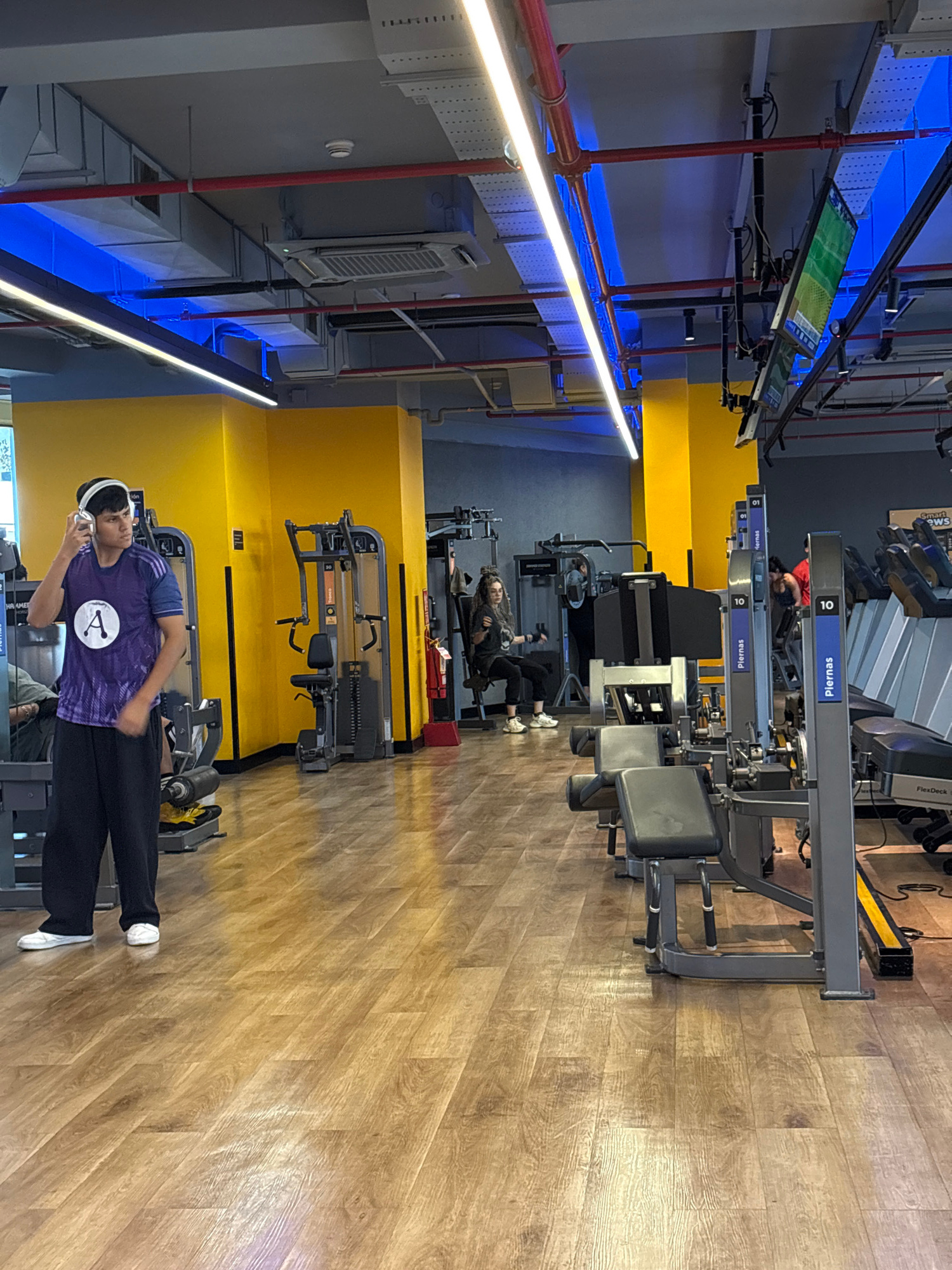 The image shows the interior of a gym, likely located in San Isidro, Peru, given the prevalence of the "Piernas" label on the equipment, which translates to "Legs" in Spanish. The gym features wooden…read more