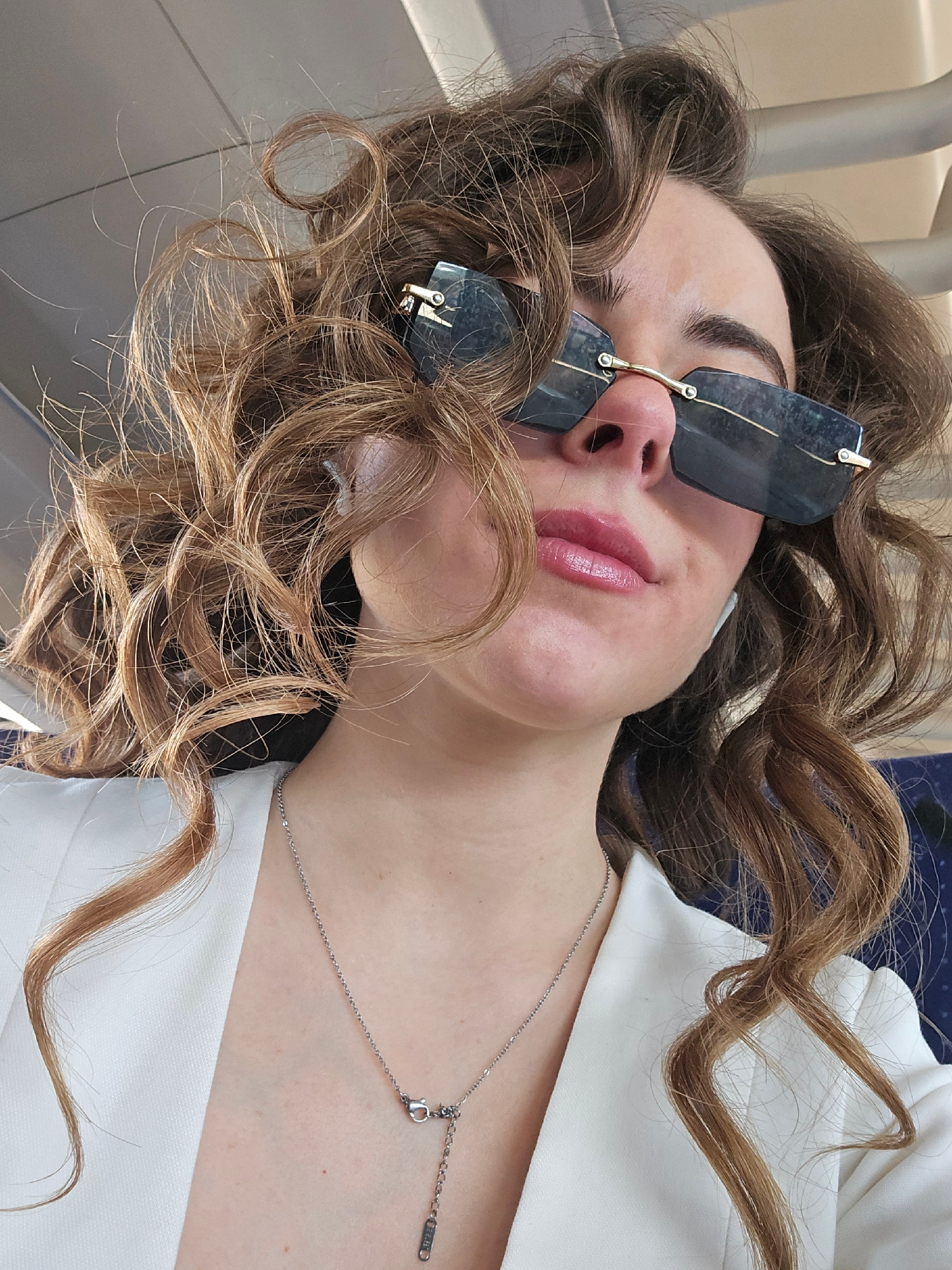 A woman with curly brown hair and sunglasses is photographed from a low angle. She is wearing a white garment and a silver necklace. The background appears to be an interior space, possibly a vehicle.…read more