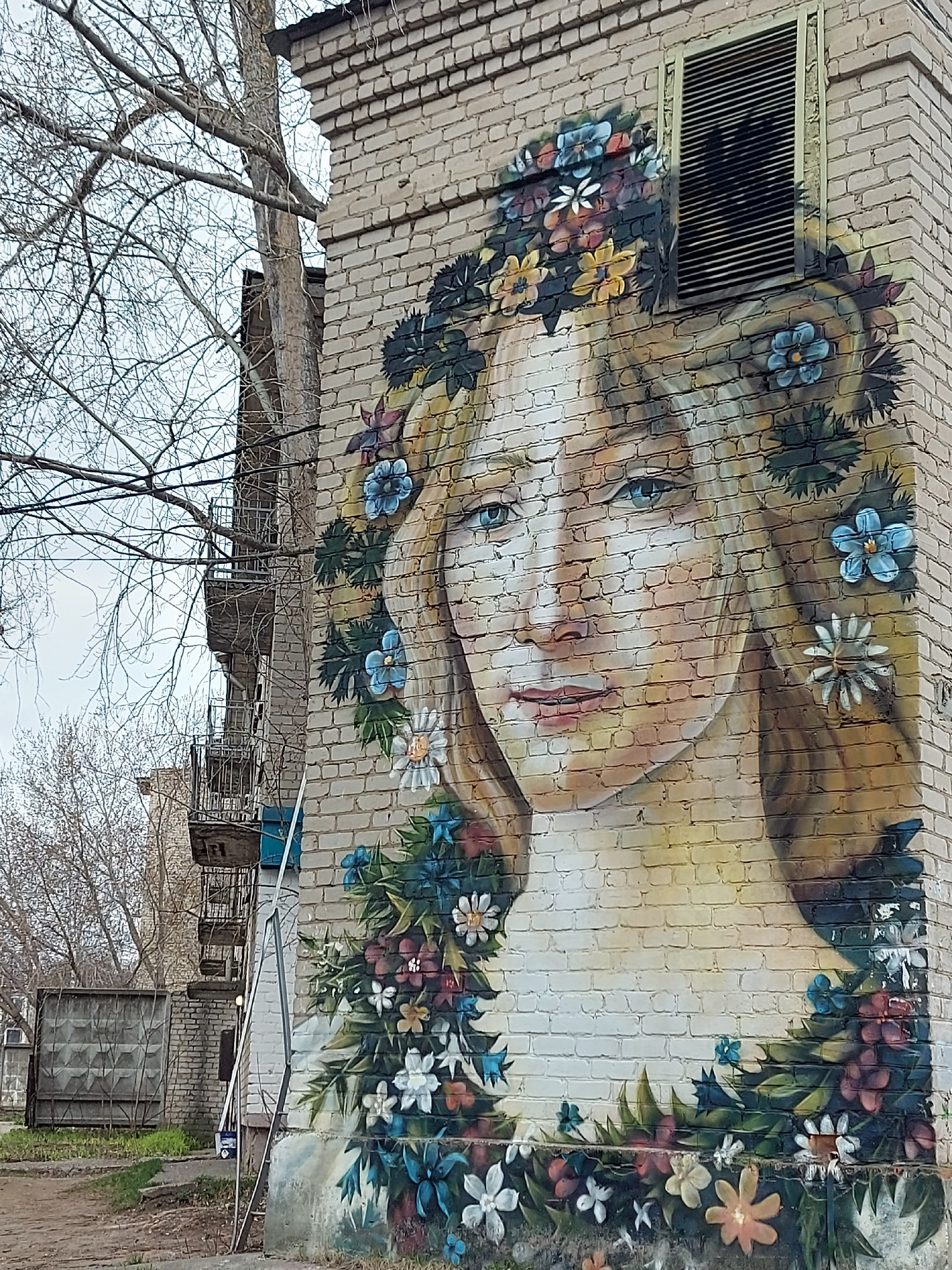 A brick wall in Chaikovsky, Russia, features a mural of a woman with blonde hair adorned with flowers. The woman's face is rendered in a pale palette, and her eyes are blue. A wreath of flowers encircβ¦read more