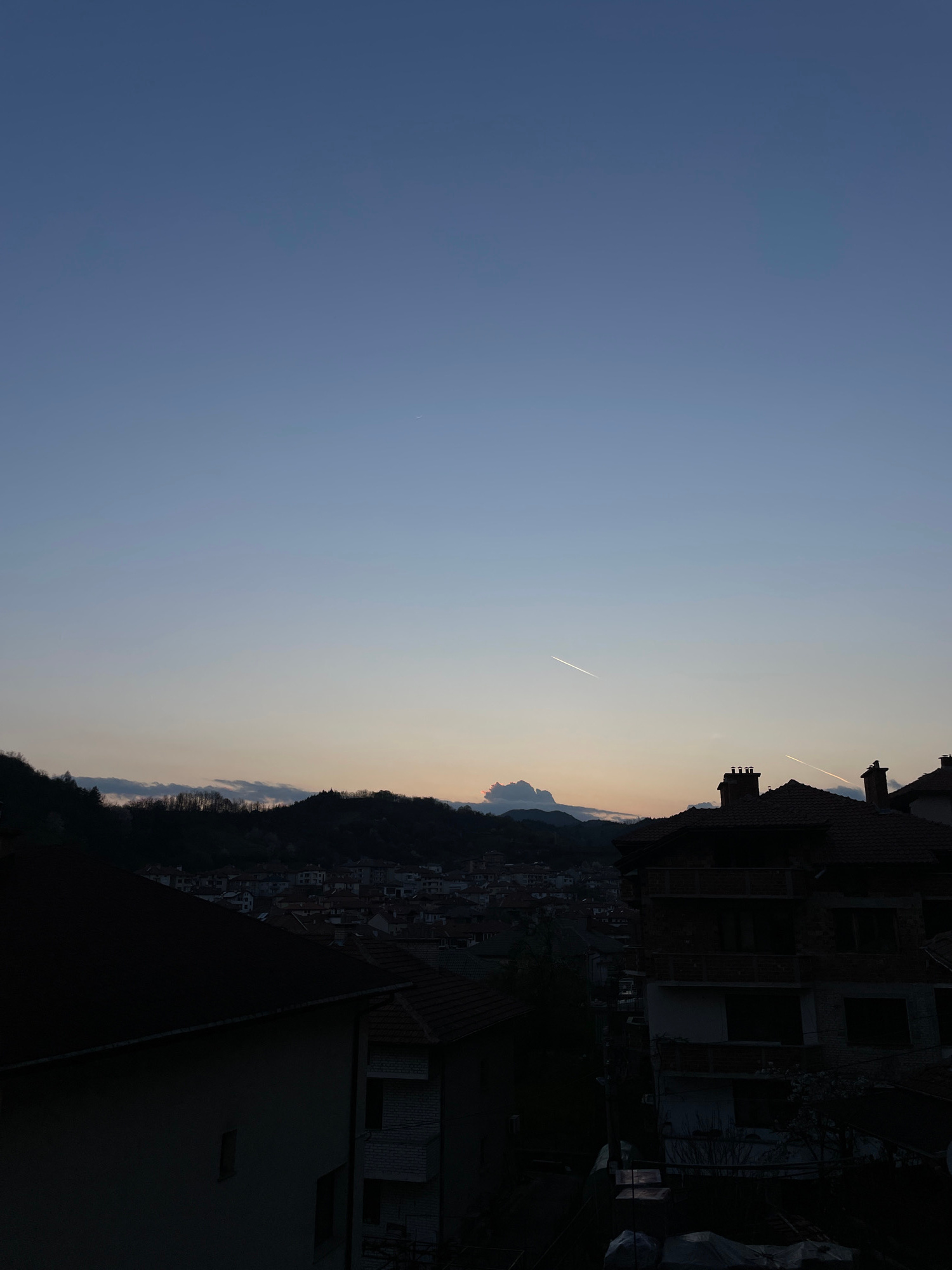 The image shows an aerial view of Zlatograd, Bulgaria. The sky is a gradient of blue to orange, indicating sunrise or sunset. There are two contrails visible in the sky. The skyline is composed of mou…read more