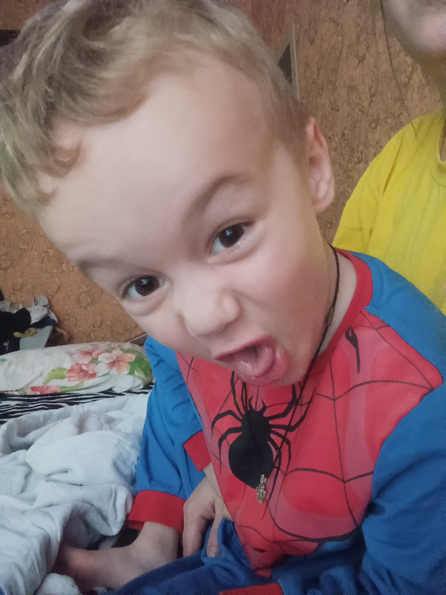 A child with light brown, wavy hair is wearing a blue and red Spider-Man-themed pajama top with a black spider graphic on the chest and a silver cross pendant on a black string around their neck. The…read more