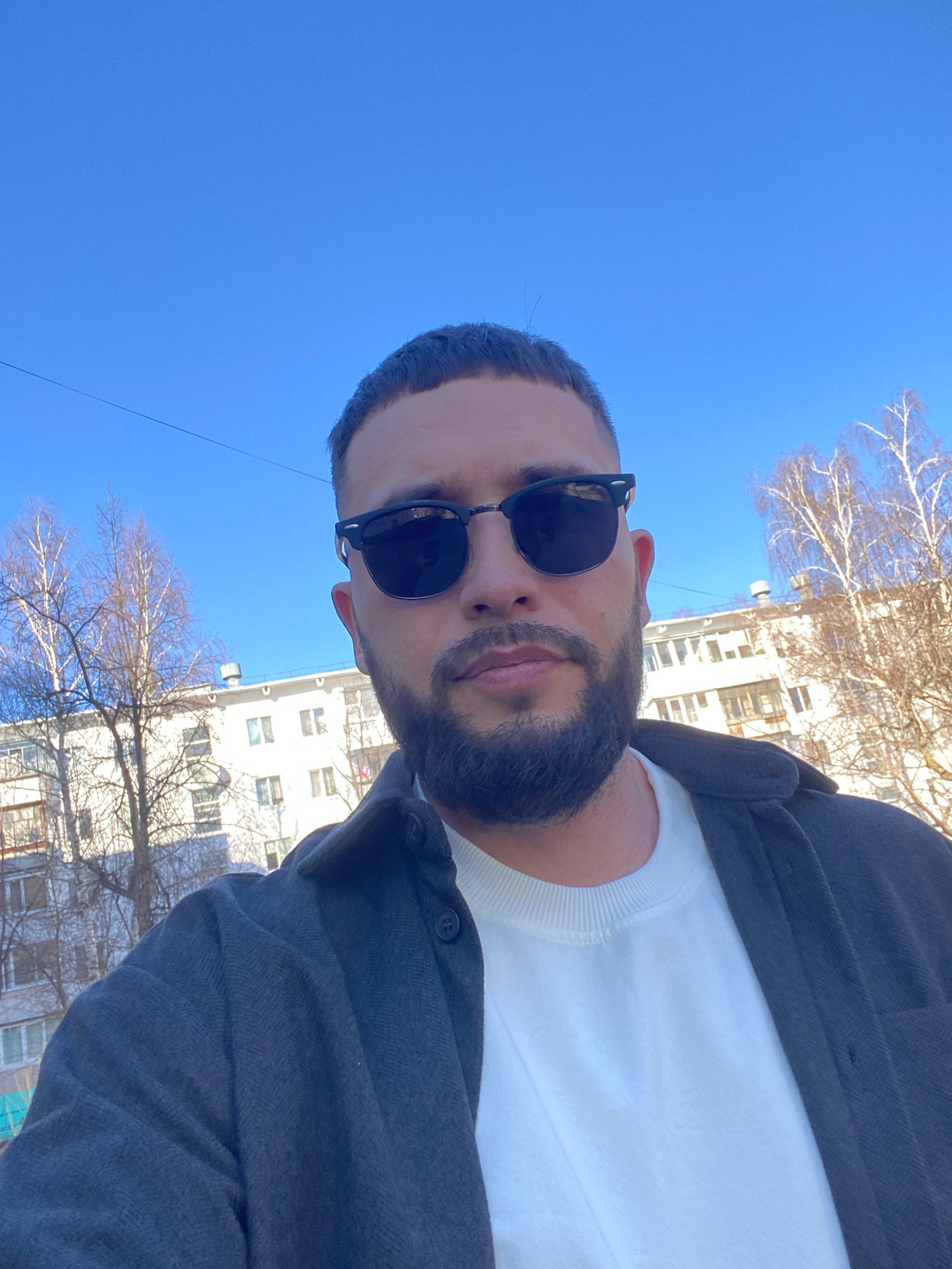 A man wearing sunglasses, a white shirt, and a dark jacket is taking a selfie outdoors. Behind him are bare trees, a light-colored multi-story building with many windows, and a clear blue sky. The loc…read more