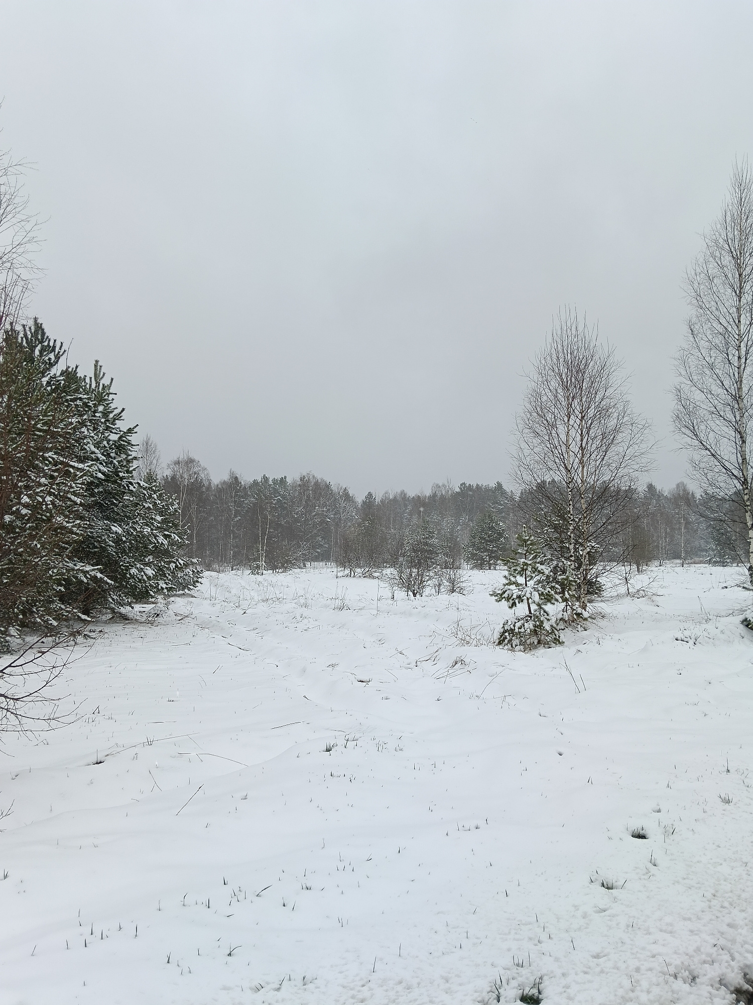 This image captures a tranquil winter landscape in Красный Маяк, Russia, presenting an open, snow-covered field bordered by a mix of coniferous and deciduous trees under an overcast sky. The foregrou…read more