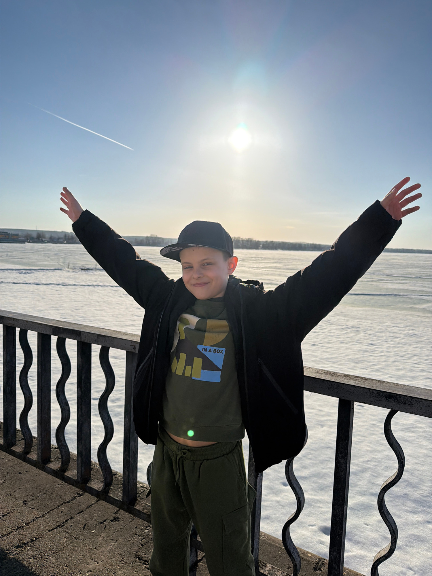 A young boy in a black jacket, olive green shirt and pants, and a black baseball cap stands on a bridge with his arms outstretched. He appears to be smiling. The backdrop features a snow-covered landsβ¦read more