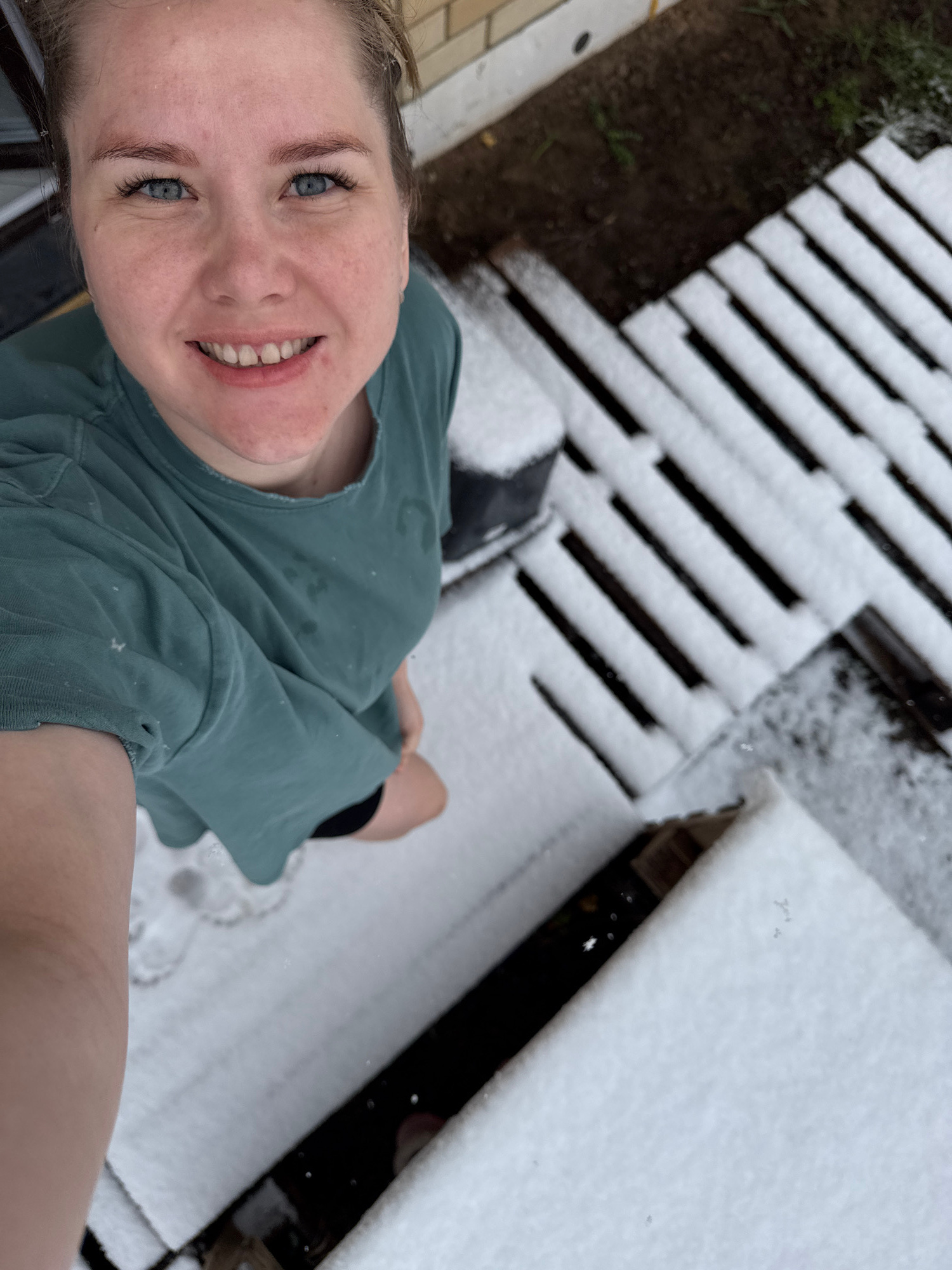 A young woman is taking a selfie outdoors on a snowy day. She is wearing a teal-colored t-shirt. Snow is visible on the ground and on a wooden structure in the background. The location is Gornyi (Dvur…read more