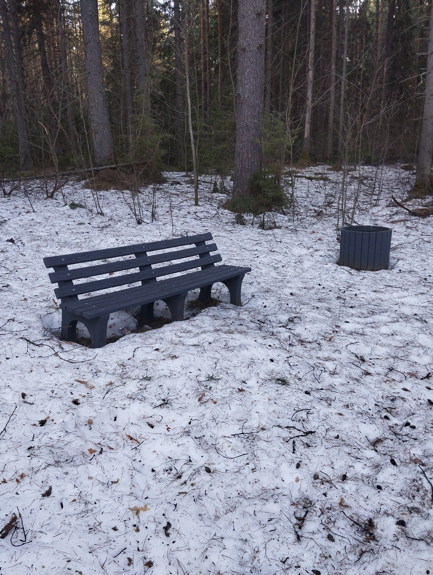 A cold, wintry scene in Votkinsk, Russia, features a dark gray park bench positioned on a light covering of snow scattered with fallen leaves, pine needles, and small twigs. The bench is composed of p…read more