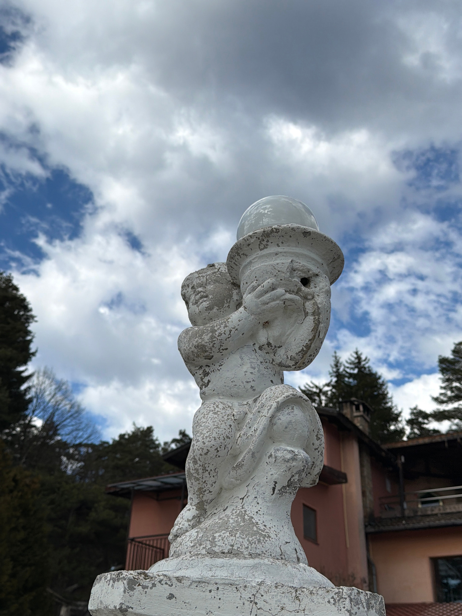 A low-angle shot of a weathered, white painted, concrete lamp post with a clear, globe-shaped light bulb. The lamp post features decorative, intertwined elements. Above, the sky is visible with patche…read more