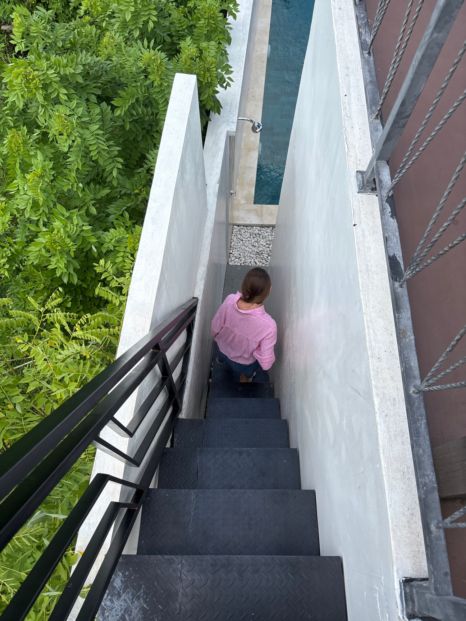 Captured from an elevated perspective, the image reveals an outdoor architectural space in Ungasan, Indonesia. A woman with short brown hair, dressed in a pink and white striped shirt and dark pants,…read more