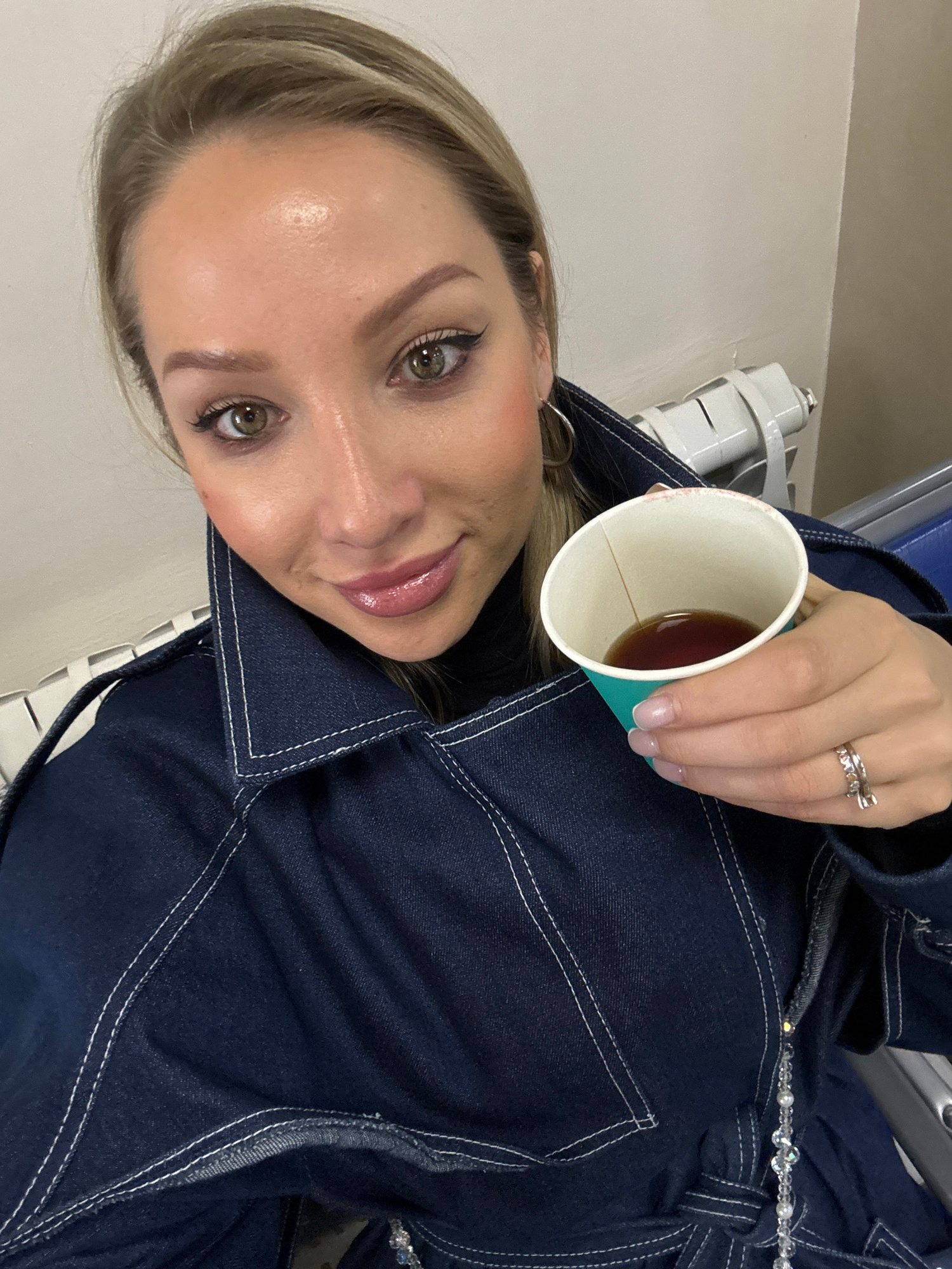 A woman is holding a cup of tea. She is wearing a denim jacket with white stitching and a decorative belt. She has blonde hair, green eyes, and a ring on her finger. The background is a light-colored…read more