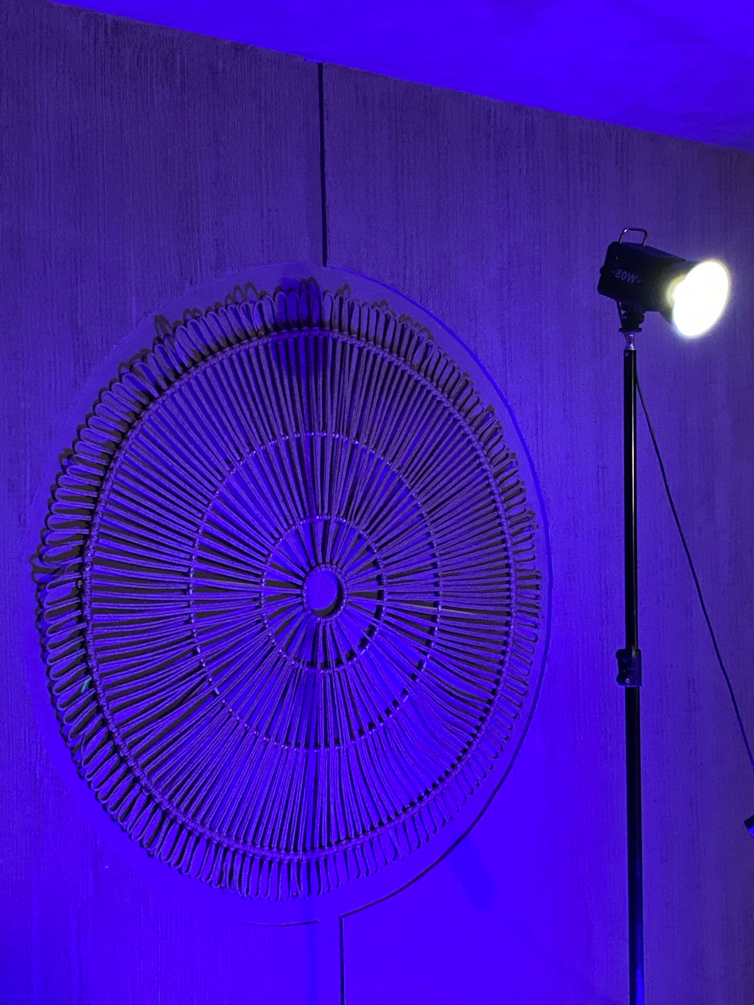 A round, wicker placemat sits under artificial lighting in what appears to be a room, likely indoors. The light source, an 80W lamp on an adjustable arm, is positioned above and to the left, casting a…read more