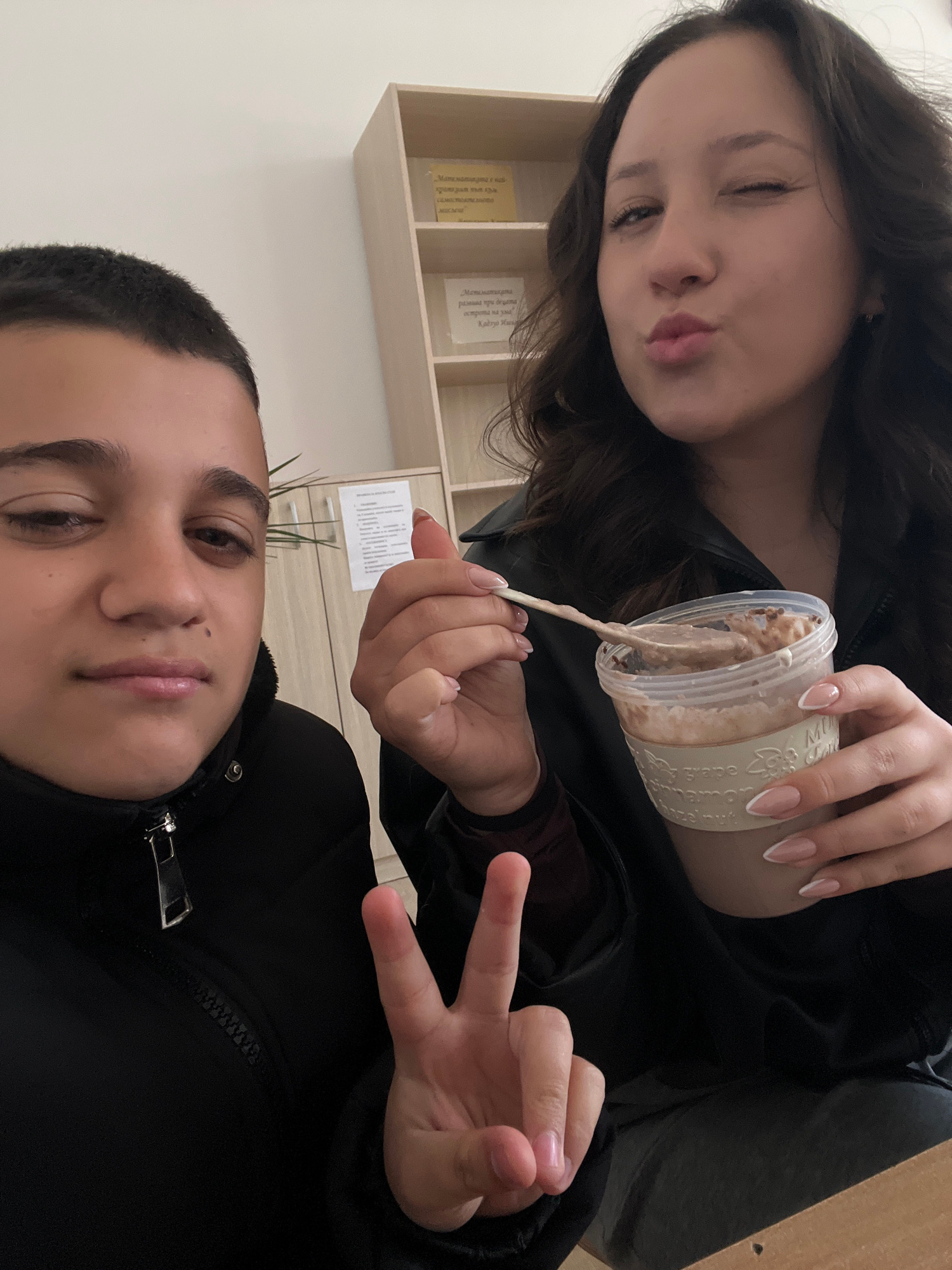 Two individuals pose in a selfie. The woman, positioned in the upper part of the frame, is tilting her head and winking. She holds a container, possibly filled with a milkshake or smoothie, with a spo…read more