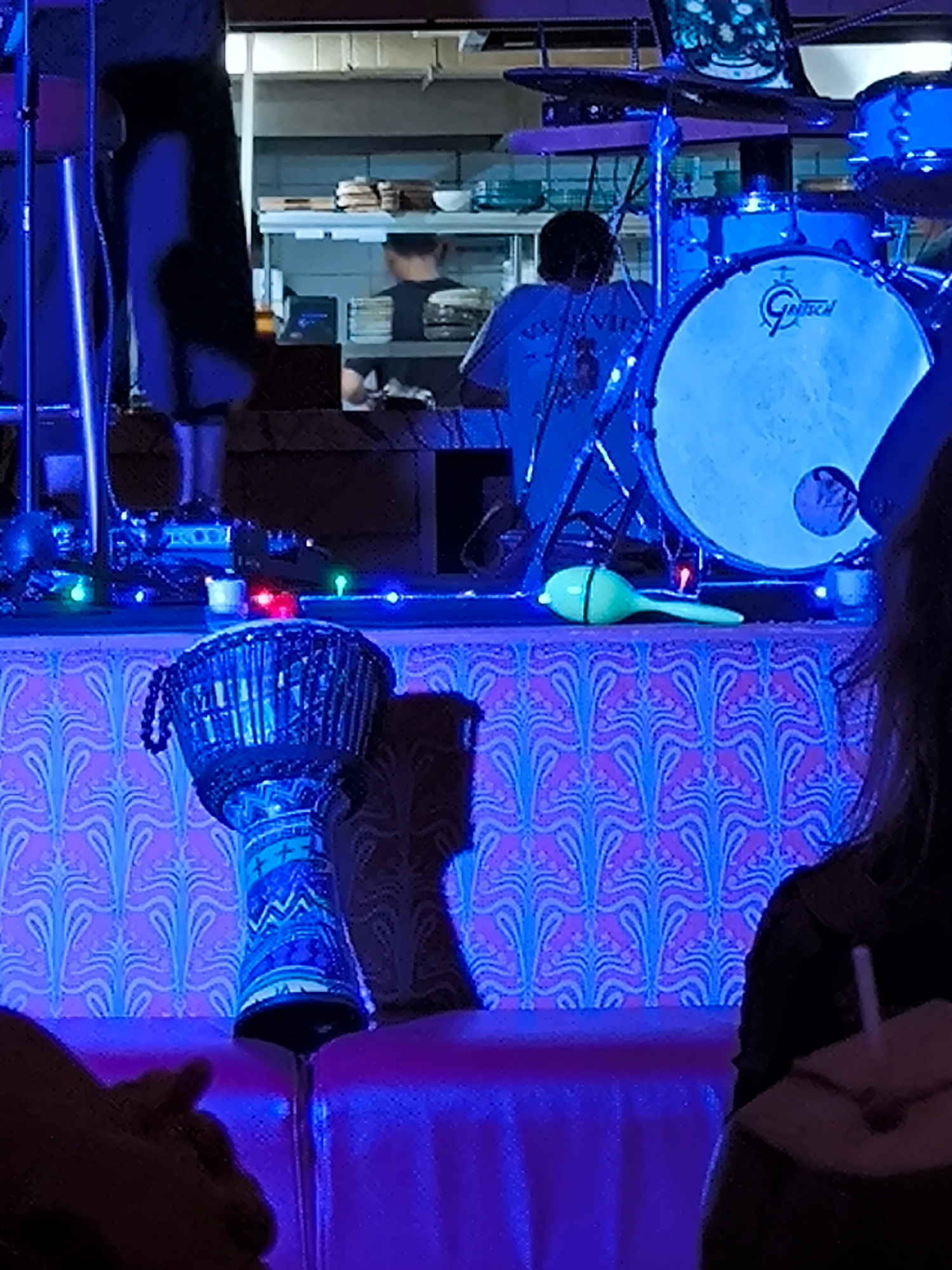 Captured under a blue lighting scheme, the image reveals a scene in North Kuta, Indonesia, potentially a live music venue or event space. A drummer is positioned behind a drum set. In the foreground i…read more
