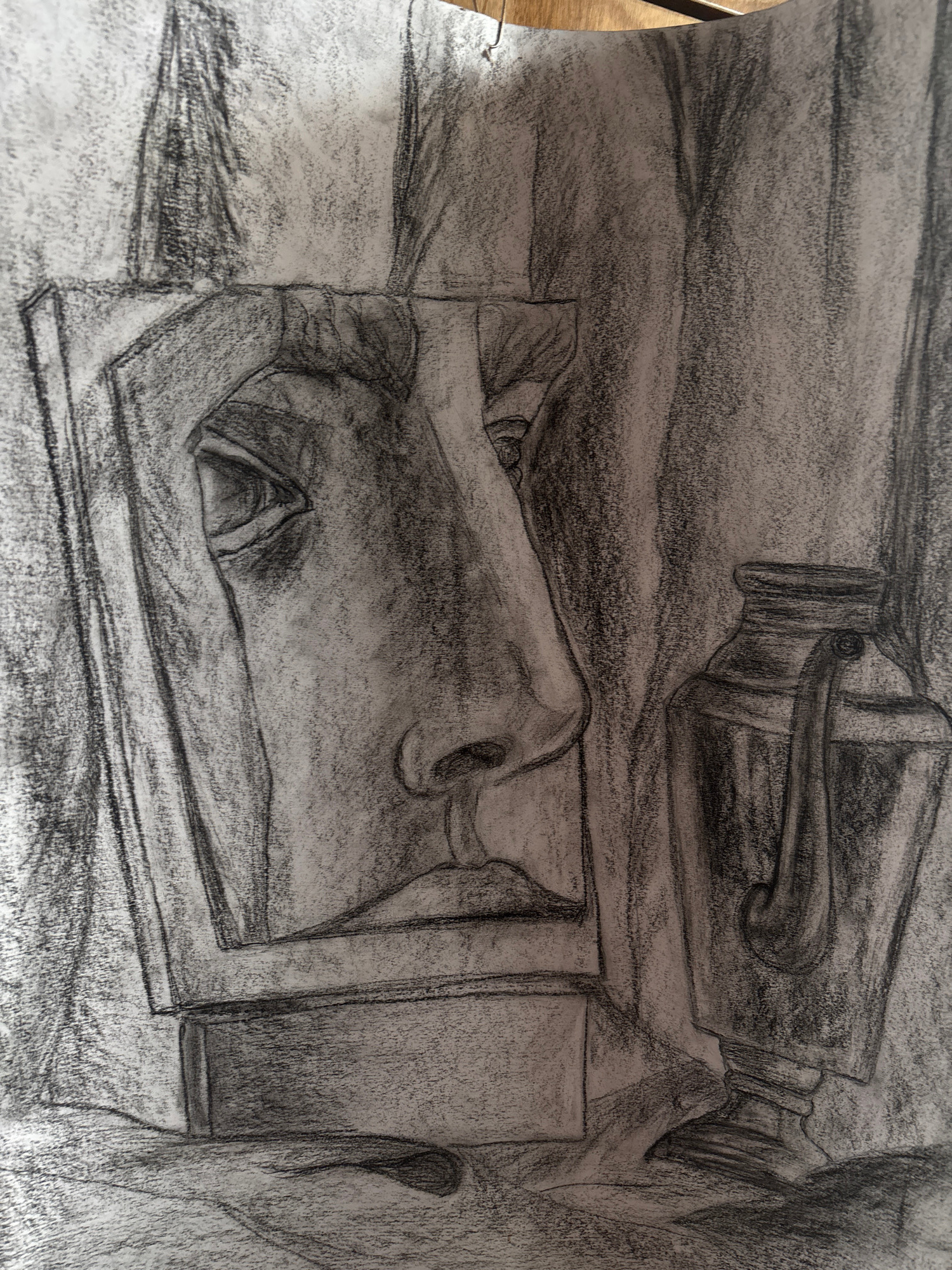 A charcoal drawing depicts a still life composition. The primary subjects are two perfume bottles, one lying horizontally and the other vertically, placed on a surface with a rectangular cutout. The b…read more