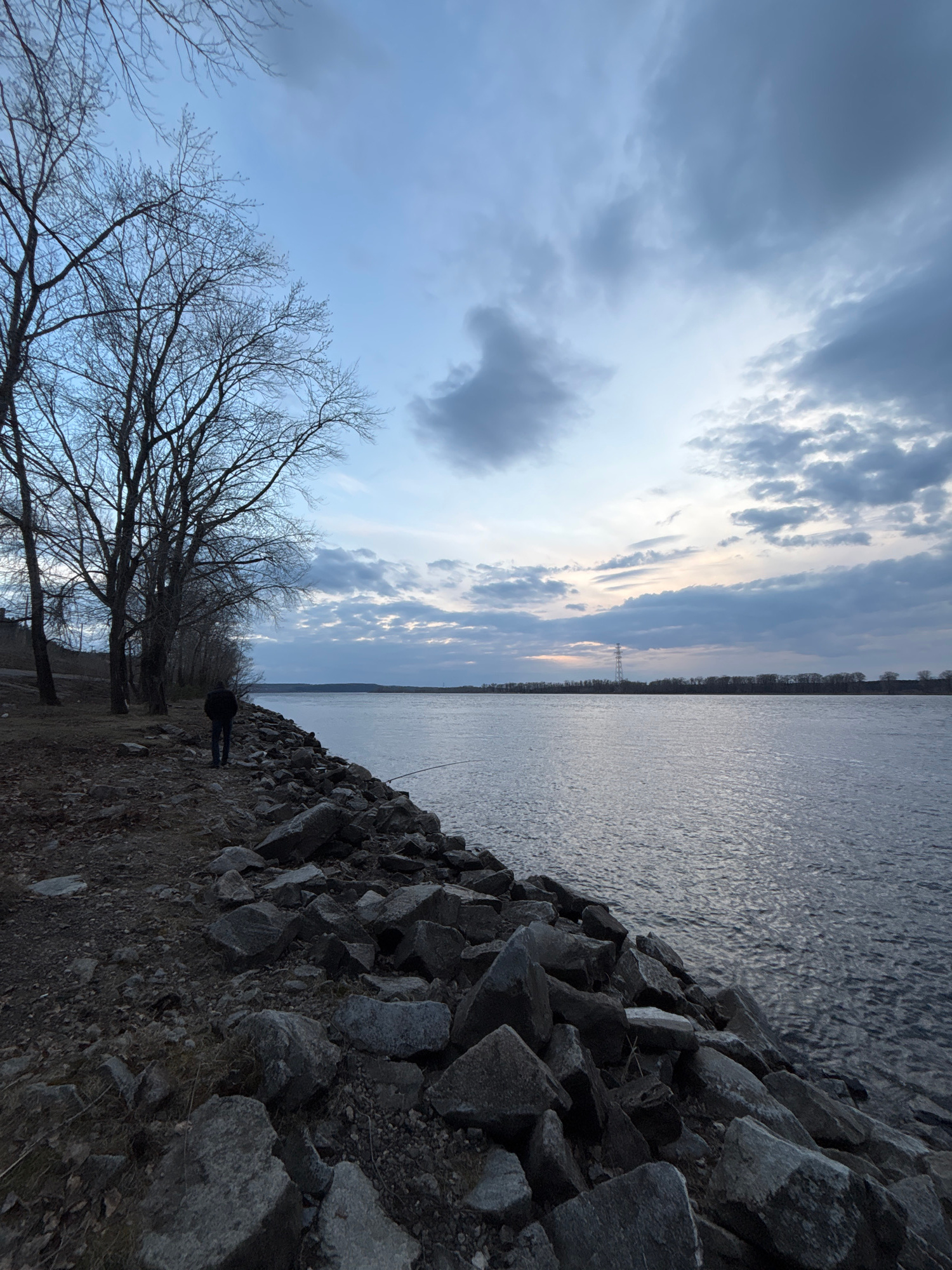 The image captures a tranquil riverside or lakeside scene in Chaikovsky, Russia, likely during late autumn or early spring given the bare branches of the trees. The expansive sky dominates the upper a…read more