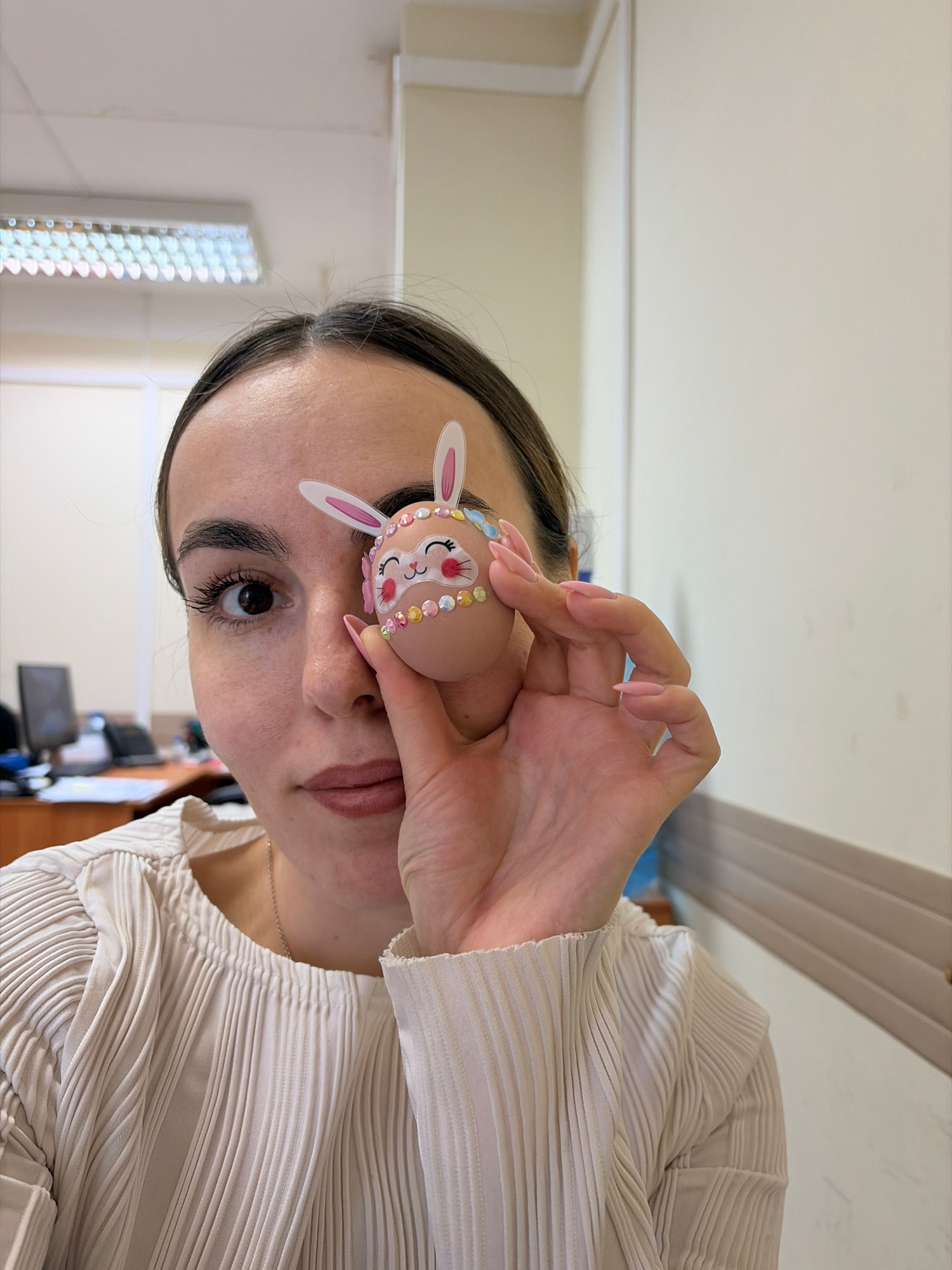 A woman is holding an Easter egg decorated as a bunny in front of her eye. The egg is brown and decorated with a paper bunny face, ears, and colorful rhinestones. The woman has dark hair pulled back, light skin, and long fingernails. She is wearing a cream-colored, pleated top. The background appears to be an office or home interior with a white ceiling and walls. A fluorescent light fixture is visible in the background. There is no definitive evidence to confirm the image's location in Izhevsk, Russia. | Open Wire