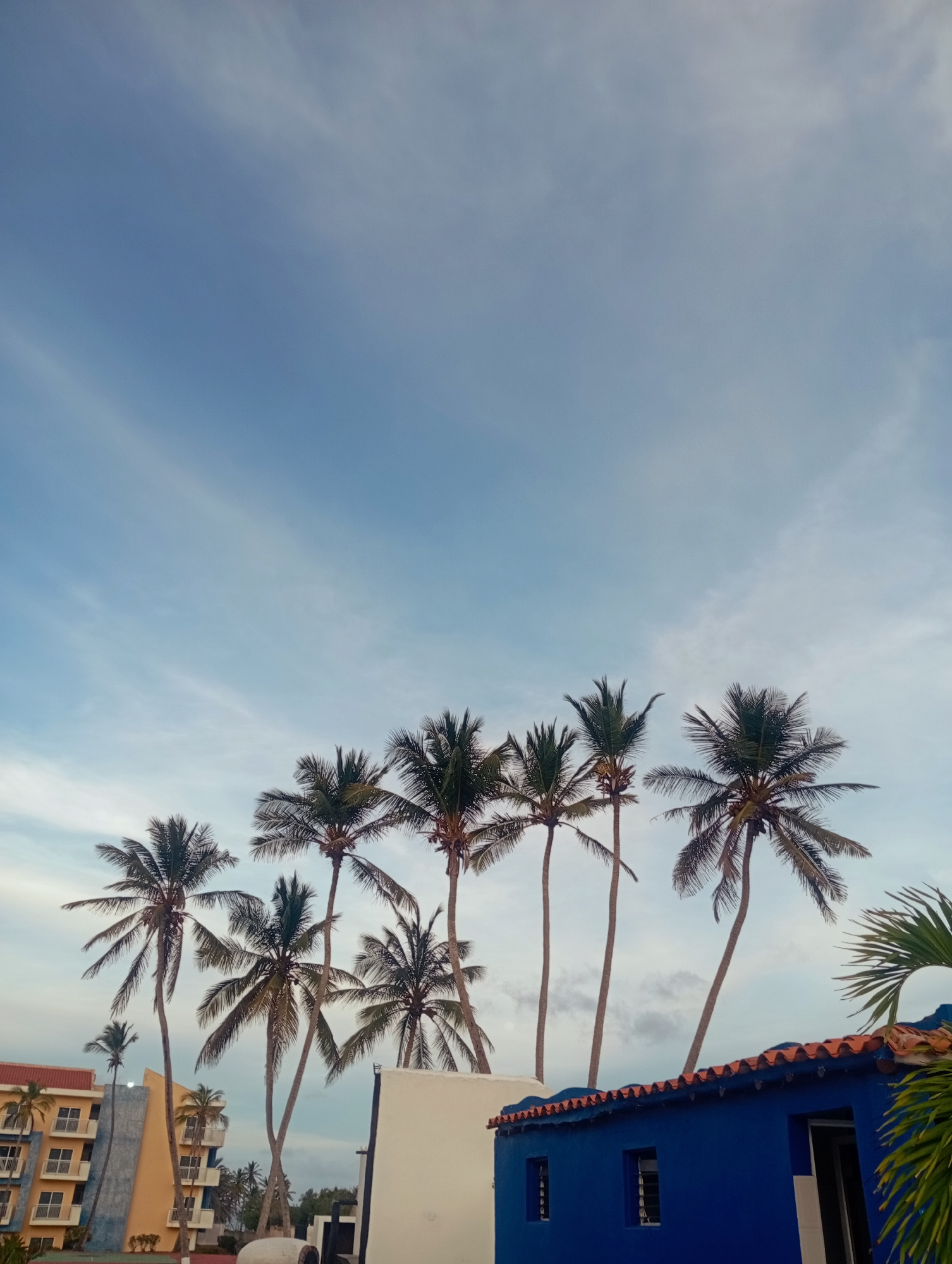 This photo was taken in Playa El Agua, Venezuela. It showcases a cluster of palm trees against a backdrop of a blue sky. In the foreground, there is a mix of buildings, including a multi-story yellow…read more