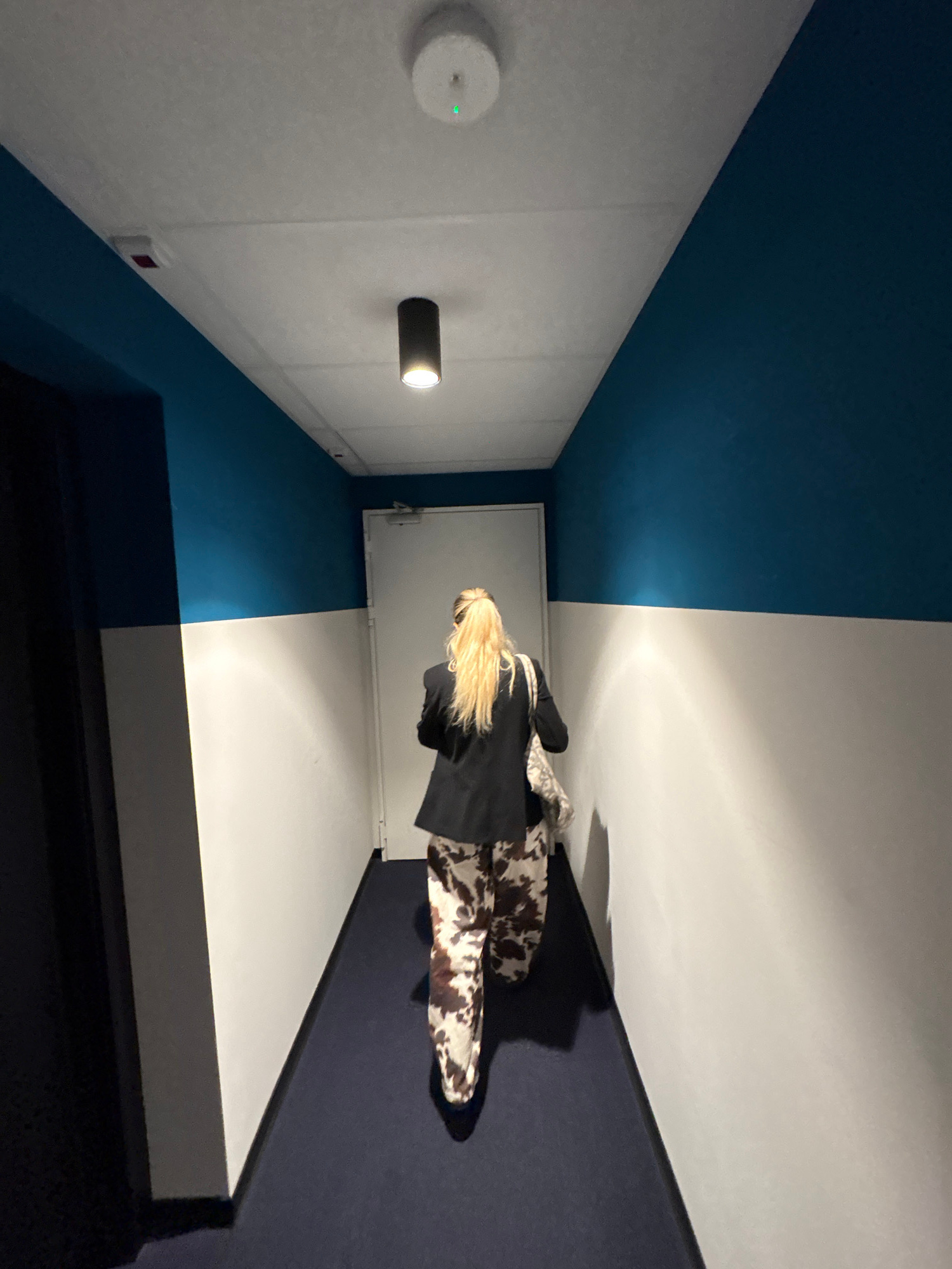 A low-angle shot depicts a corridor in Novate Milanese, Italy. The walls of the corridor are primarily white and blue, and the ceiling is also divided into white and blue sections. The lighting appear…read more