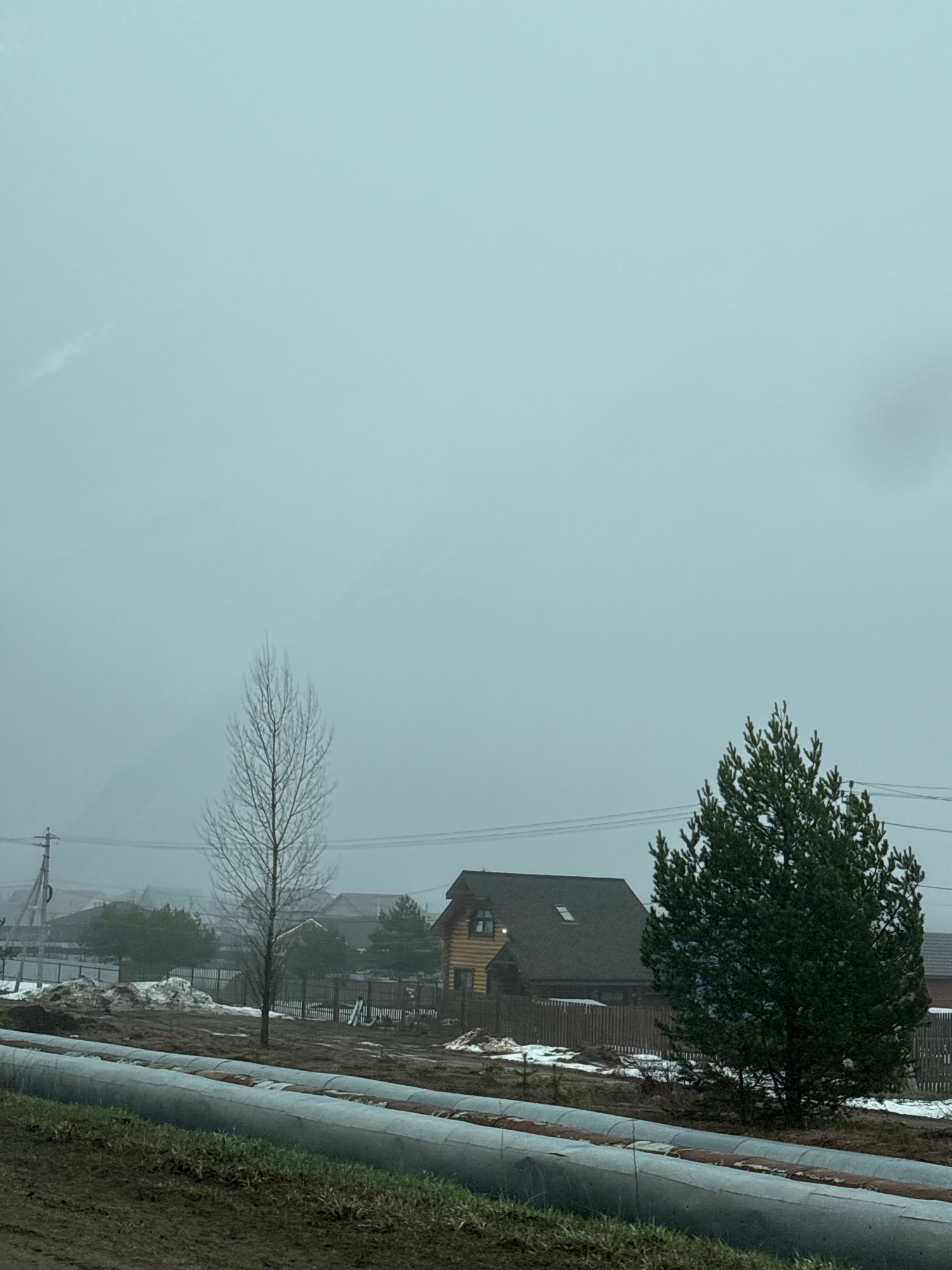 The image depicts a view of a residential area under an overcast sky, potentially in the city of Прикамский, Russia. There are several houses visible, some partially obscured by trees and the foggy at…read more
