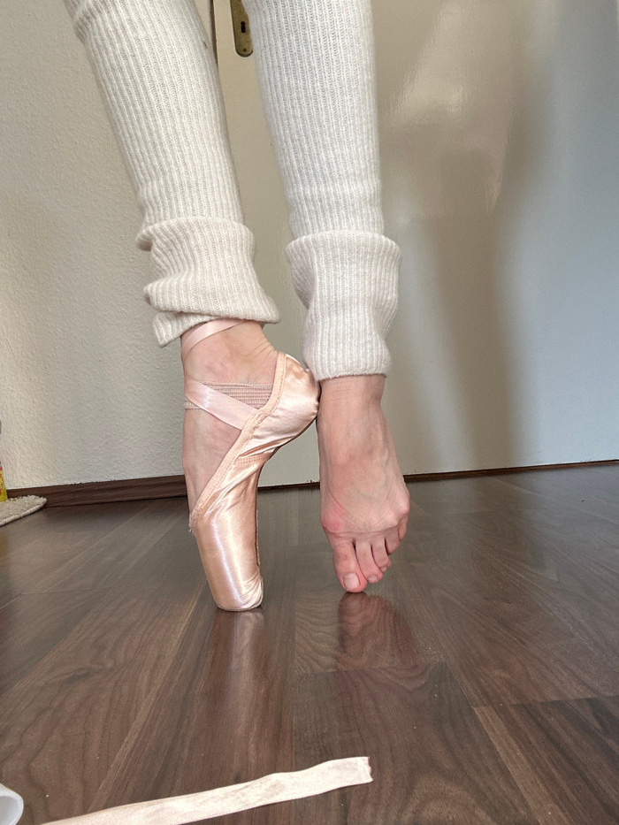 The image displays the lower legs and feet of an individual within an indeterminate indoor setting in the city of Unknown, Unknown. The subject wears cream-colored, ribbed leg warmers scrunched around…read more