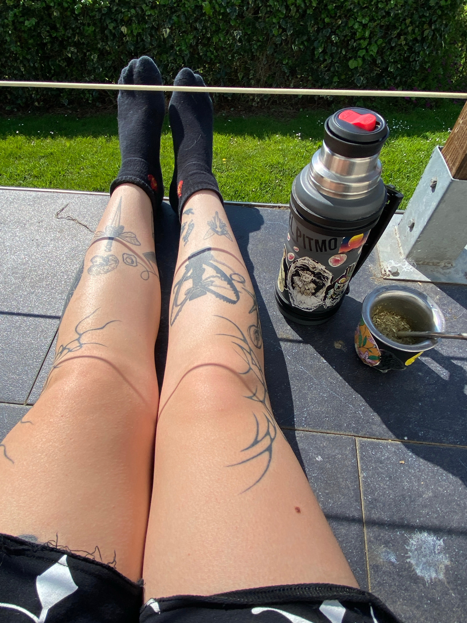 The image shows a person sitting with legs outstretched on a grey tiled surface, likely an outdoor patio. The person is wearing black socks and patterned black and white shorts. Both legs have multipl…read more
