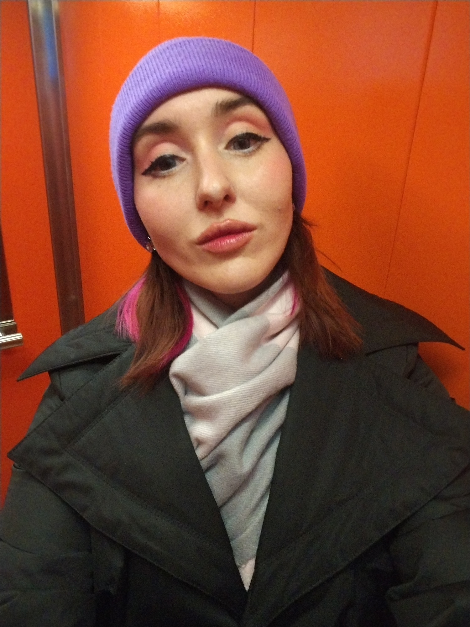 A woman wearing a purple beanie, a gray scarf, and a black coat is in an elevator with orange walls. The woman has pink highlights in her hair. A metal handrail is visible on the left side of the imag…read more