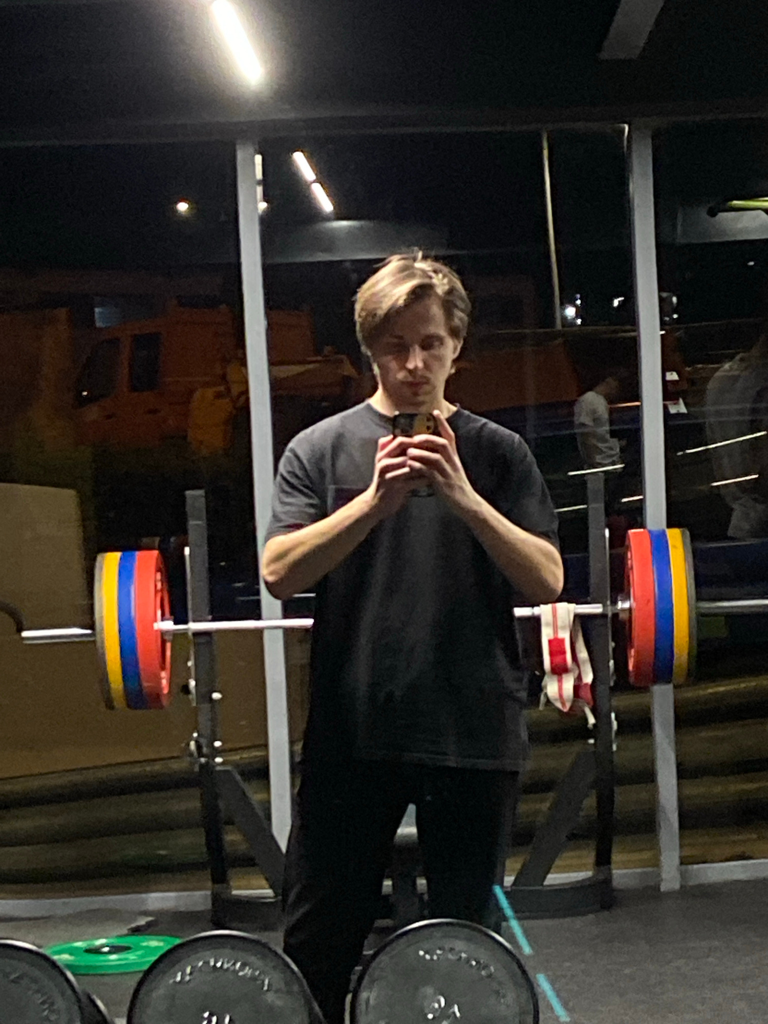 A person is taking a selfie in a gym, possibly in Bar, Montenegro. The person is wearing a dark t-shirt and dark pants. A barbell is visible, loaded with weight plates. The gym appears to have a mirro…read more
