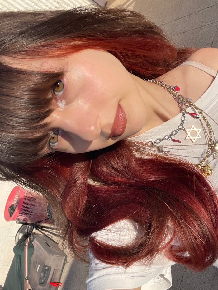 The image displays a close-up, overhead portrait of a female individual taken outdoors under direct sunlight, situated in Petah Tikva, Israel. The subject has dark brown hair with prominent auburn/redβ¦read more