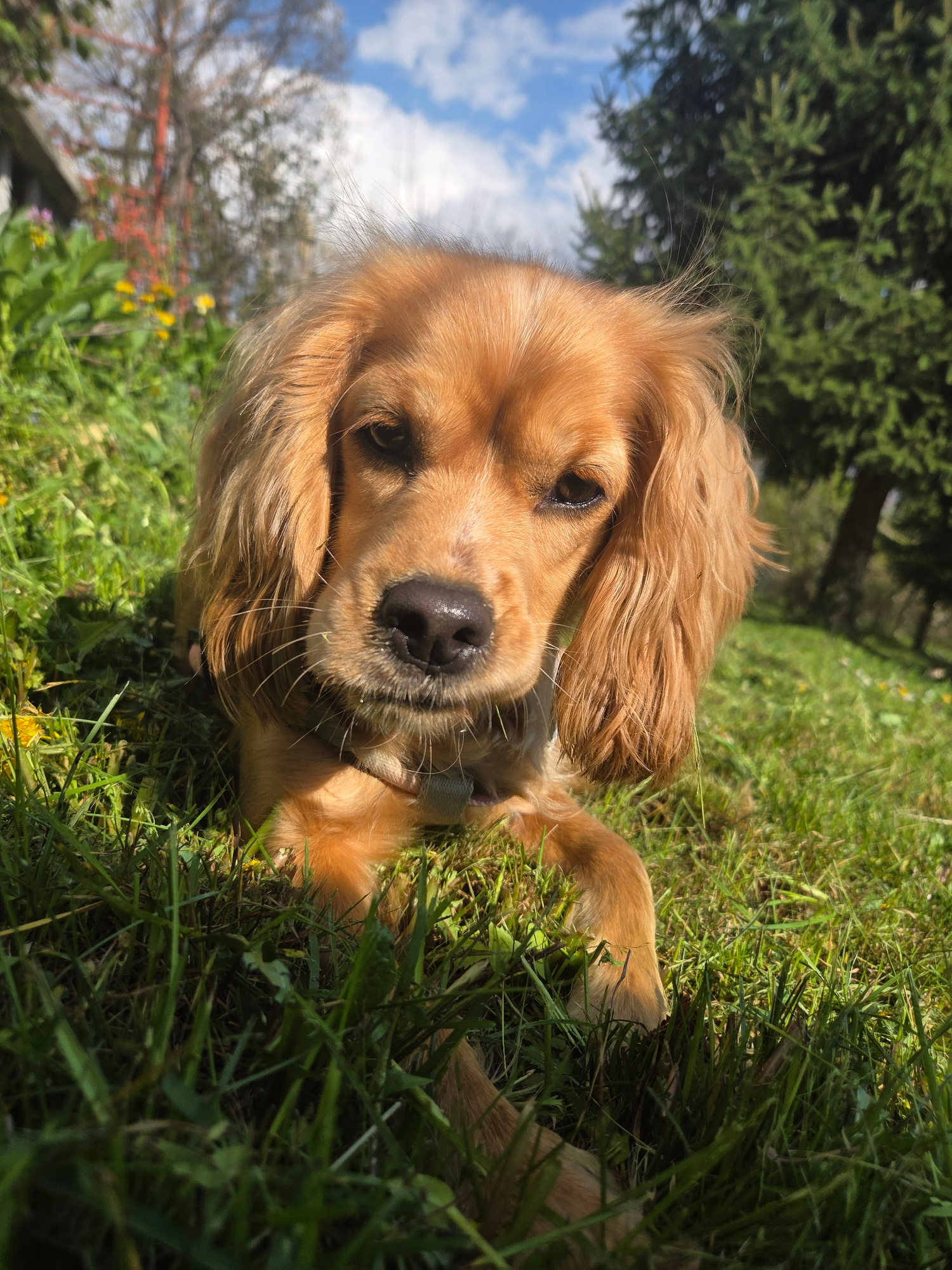 A close-up, slightly tilted, outdoor shot features a golden Cocker Spaniel lying in lush green grass. The dog's head is central, with its nose and eyes in sharp focus. The dog's coat is shiny and well…read more