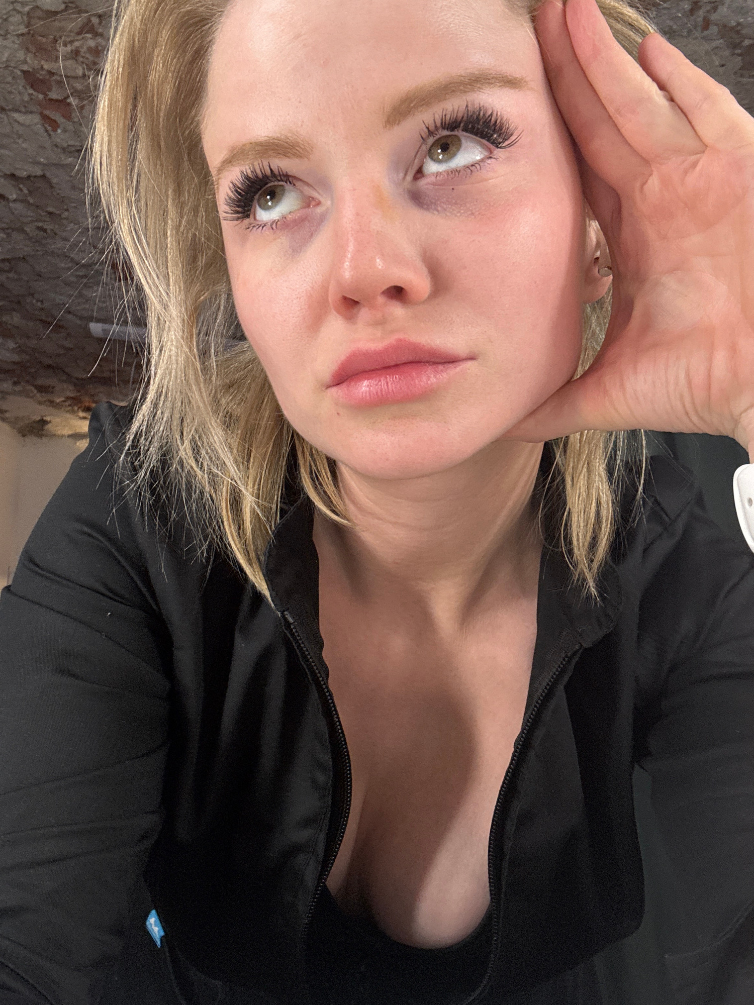 A fair-skinned individual with blonde hair is shown in a close-up, angled selfie. The person is wearing a black zip-up top. They have hazel eyes and pink lips. Their left hand is raised, with fingers…read more