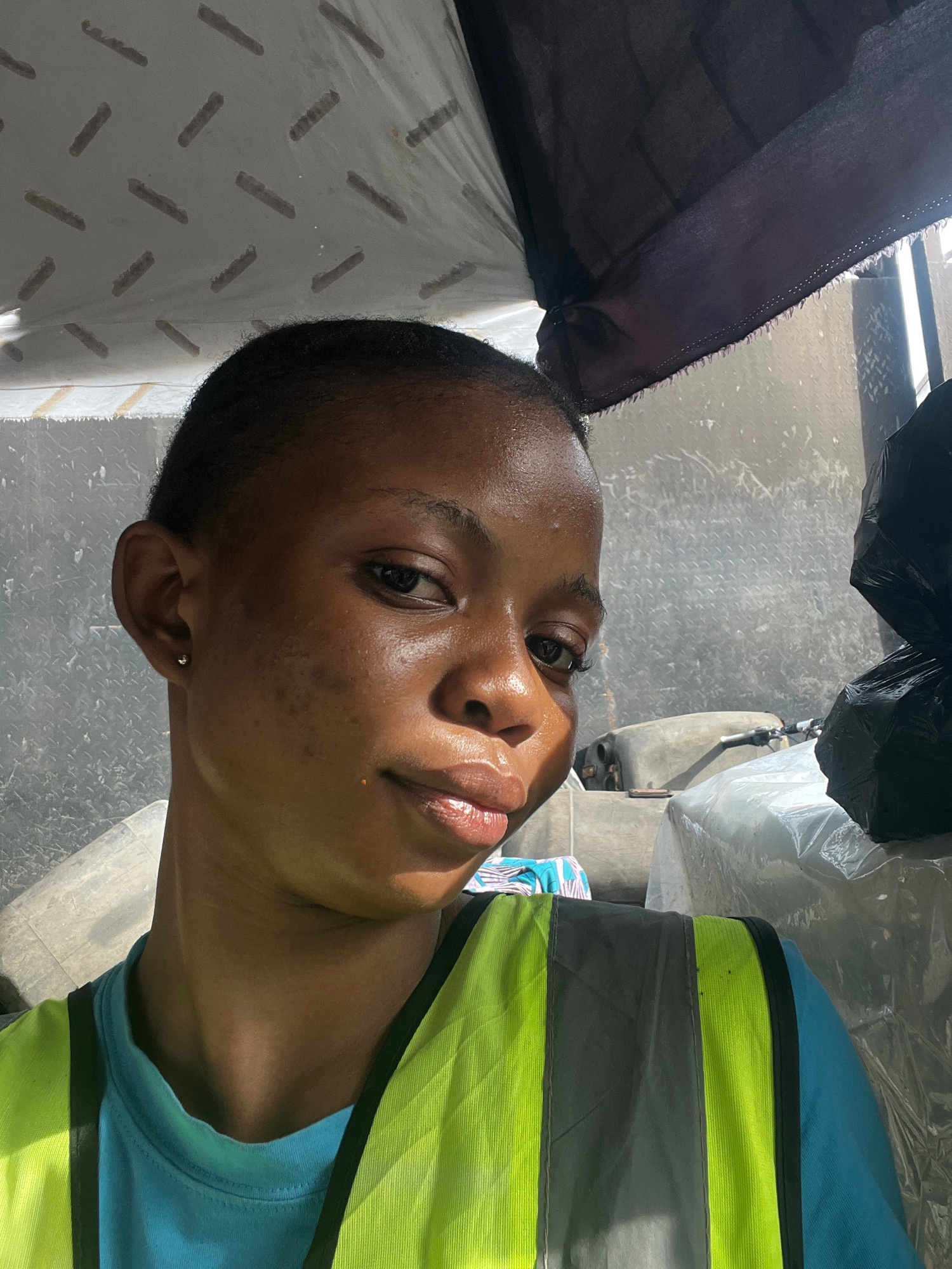 A close-up, slightly tilted portrait-style shot captures a person with dark skin and short, closely cropped hair, looking directly towards the camera. The individual wears a light blue t-shirt beneath…read more