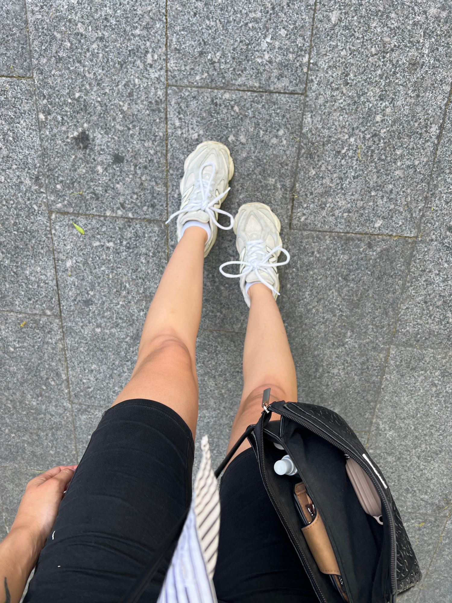 The image shows a person standing on a gray tiled surface, likely a sidewalk in an urban environment. The location is Unknown, Vietnam. The person is wearing black shorts and white sneakers with untie…read more