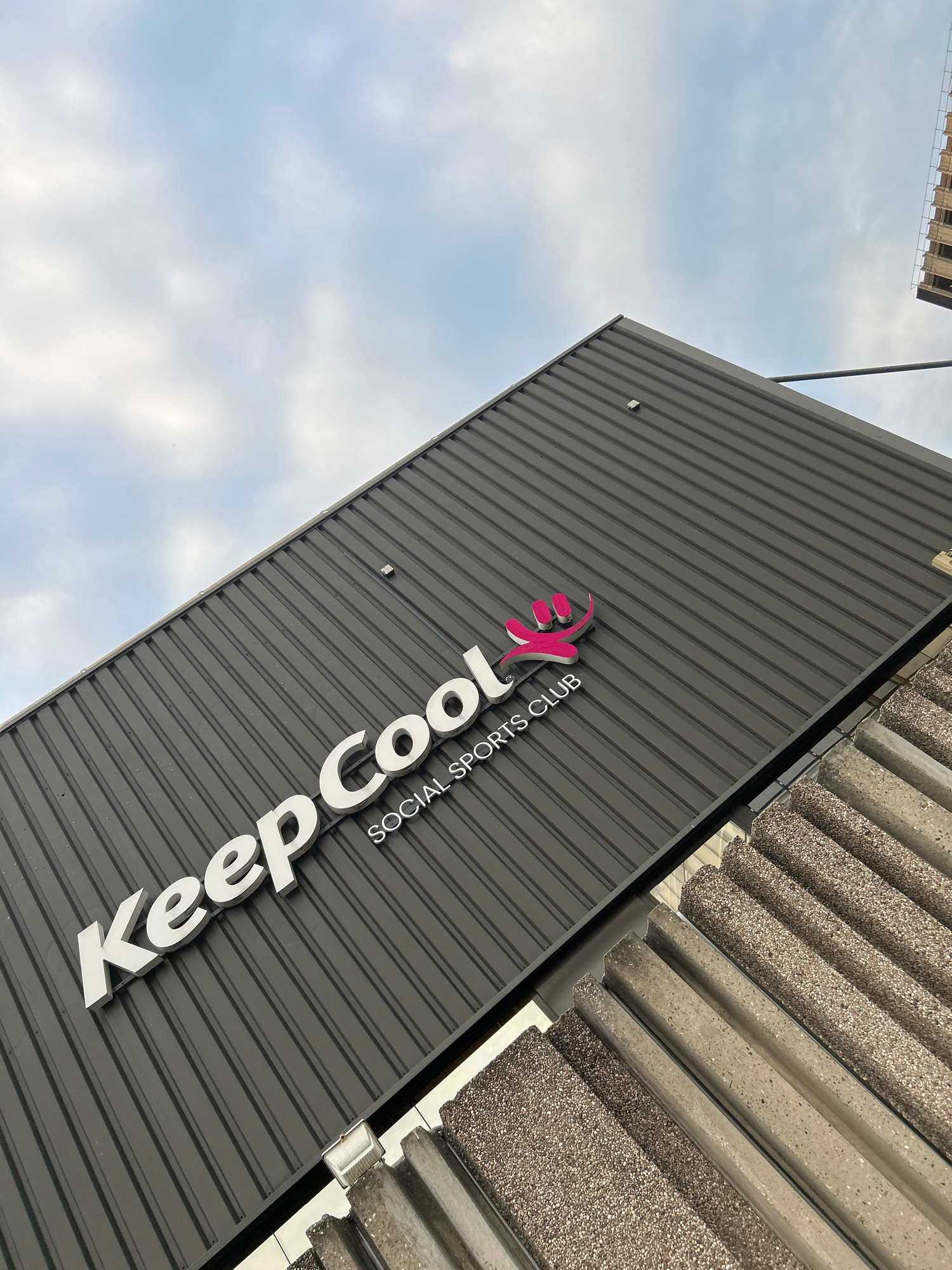 An angled, upward shot reveals a gray, corrugated building facade with the sign "Keep Cool SOCIAL SPORTS CLUB" in white and pink lettering. The sky, visible in the background, is overcast with pale gr…read more