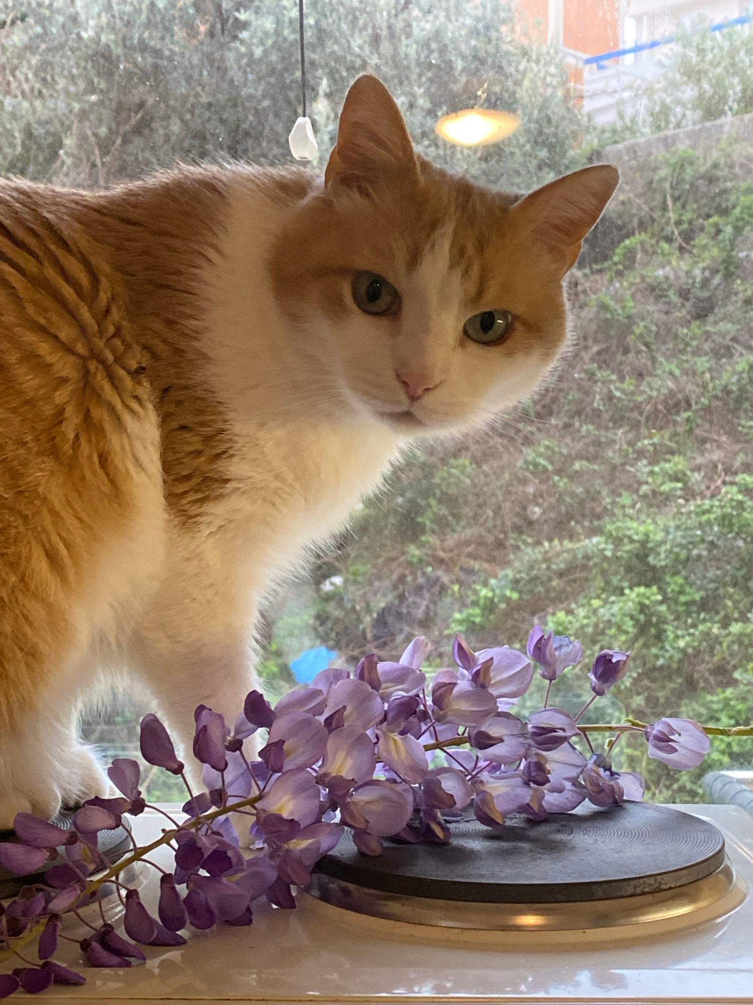 This image captures an indoor scene in Sveti Stefan, Montenegro, featuring an orange and white domestic cat and a branch of wisteria flowers. The cat, predominantly orange with white markings on its f…read more