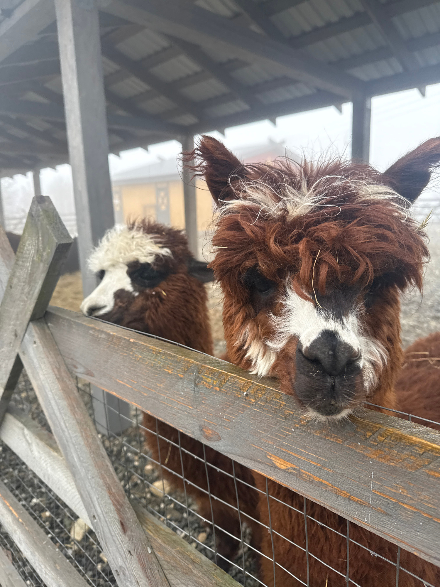 The scene captures two alpacas in an outdoor enclosure in Estosadok, Russia, under foggy conditions. In the foreground, a reddish-brown alpaca with a white patch on its forehead extending to a black-nā¦read more