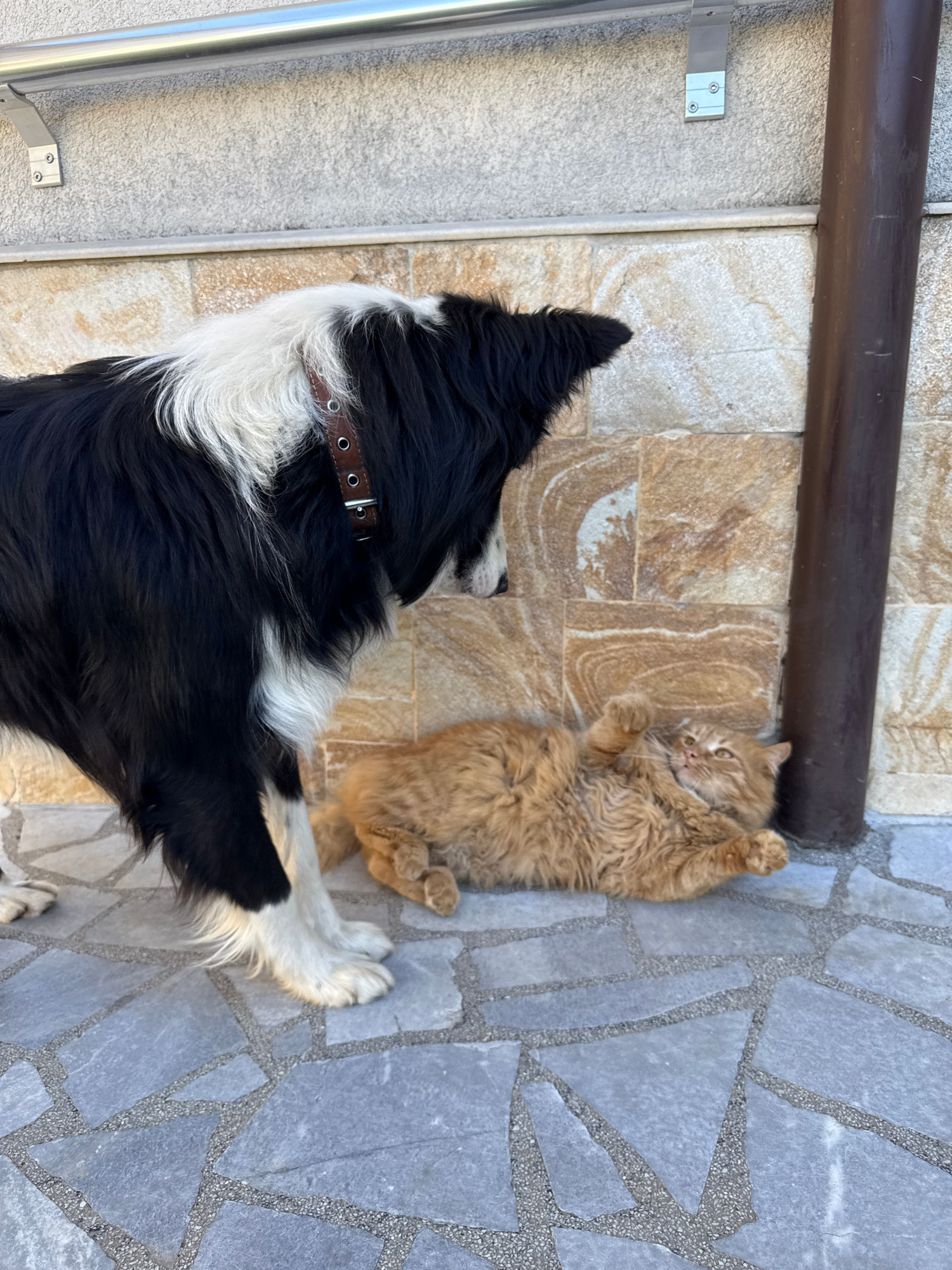 On a patio likely located in Berkovitsa, Bulgaria, a black and white border collie dog with a brown collar stands near an orange cat lying on its back. The patio surface is a mix of light grey paving…read more