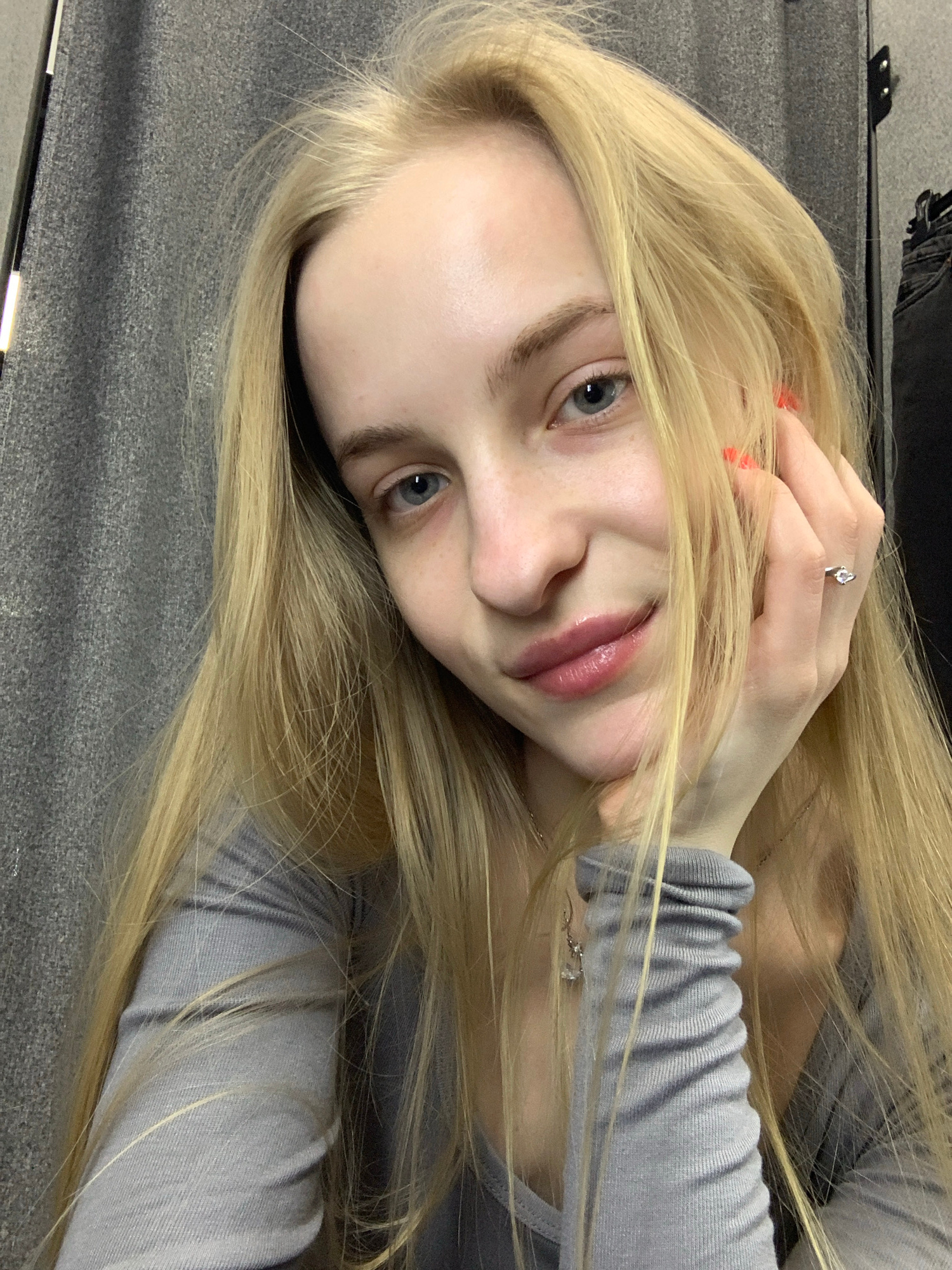 A young woman with light blonde, straight hair is lying on a gray upholstered surface. She is wearing a light gray long-sleeved shirt. Her left hand is raised, with a ring visible on her ring finger a…read more