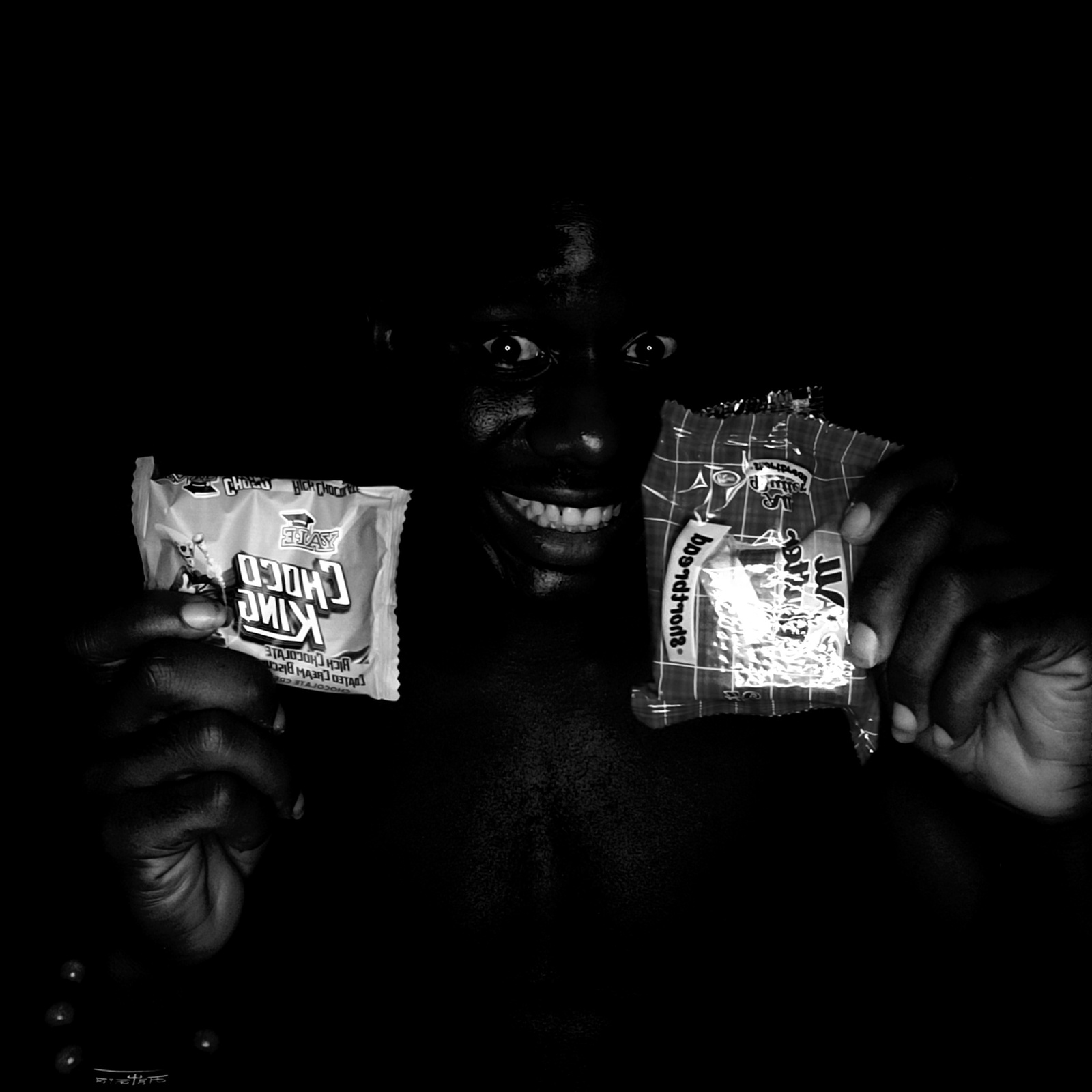 A black and white photograph depicts a person, likely lying down, smiling with teeth visible. Two hands hold packets of sweets above and below the person's face. The upper packet is checkered with ind…read more