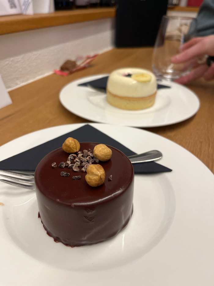 Two desserts sit on white plates with black napkins. The closest dessert is a dark chocolate cylinder, adorned with three hazelnuts and cocoa nibs. A fork rests beside it on the napkin. The other dess…read more