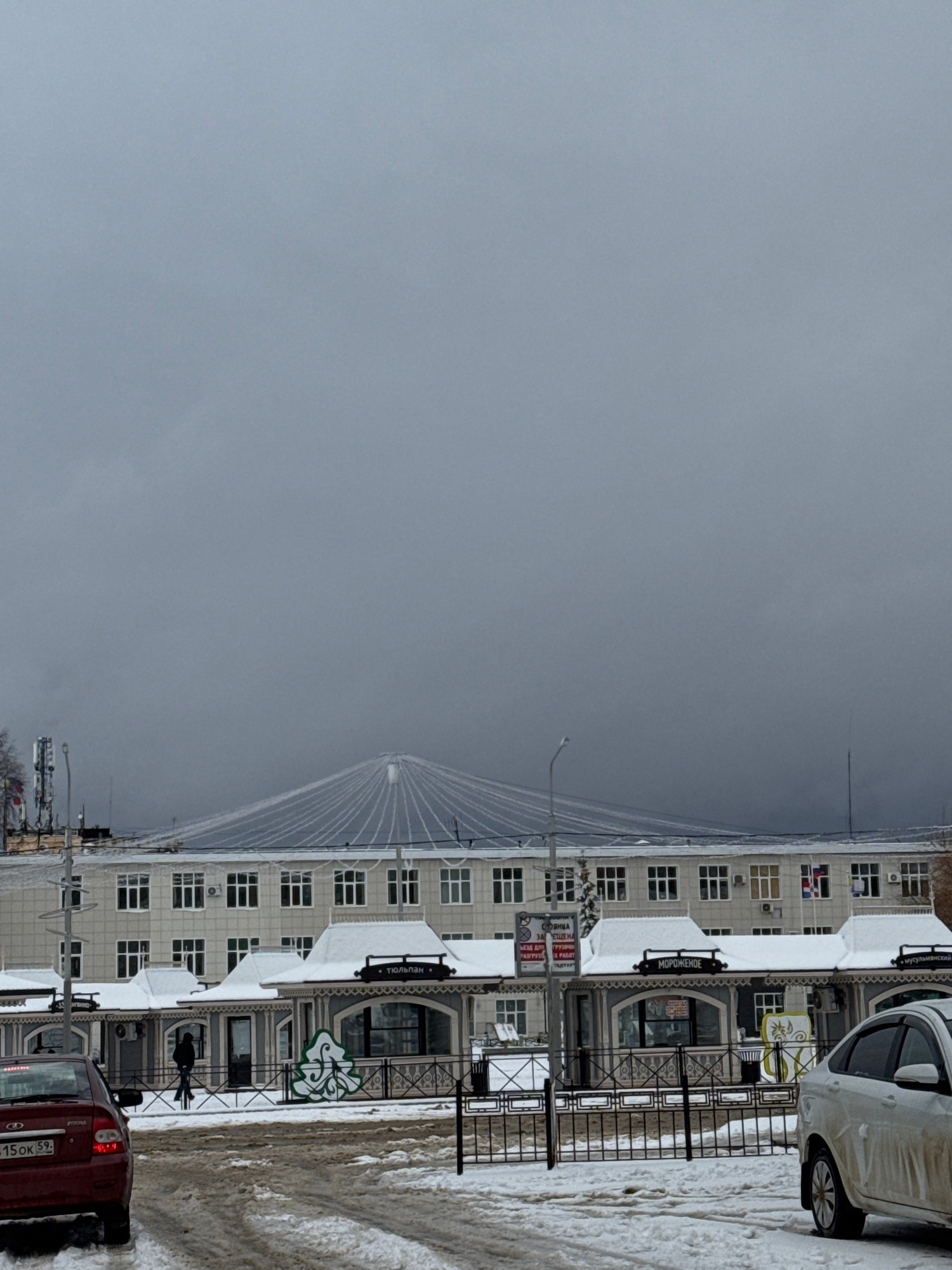 The image shows a street scene in Chernushka, Russia, on a cloudy day with snow on the ground. A suspension bridge stretches across the upper part of the frame. A multistory building lines the right s…read more