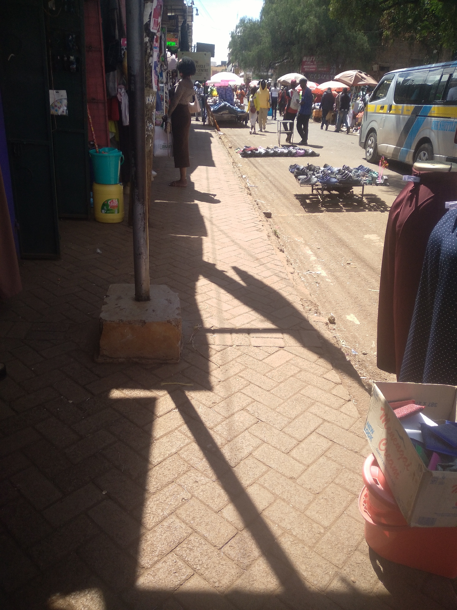 The scene depicts an outdoor market in Nyeri, Kenya. A street lined with vendors selling goods is visible, with a minivan parked nearby. People are browsing and interacting with the merchandise. The g…read more