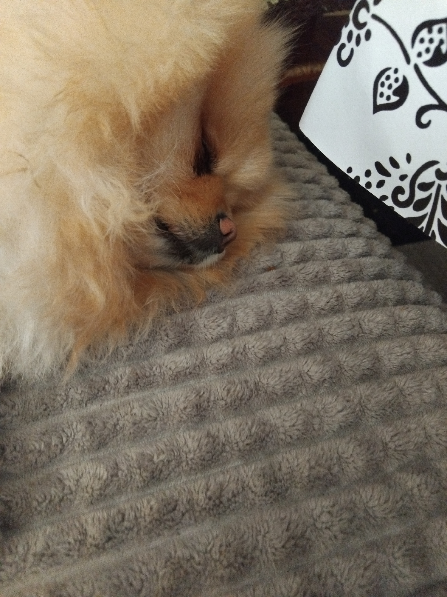 A tan Pomeranian dog sleeps on a gray, ribbed cushion. A corner of a black and white patterned object is visible in the upper left corner. The photo appears to be taken indoors. It is not possible to…read more
