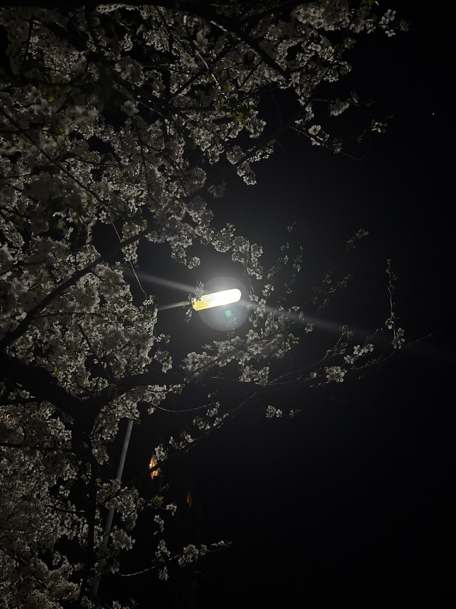 A nighttime scene featuring flowering trees, possibly in Berkovitsa, Bulgaria, is illuminated by a vertical light fixture. The trees are adorned with white blossoms, and the background is predominantl…read more