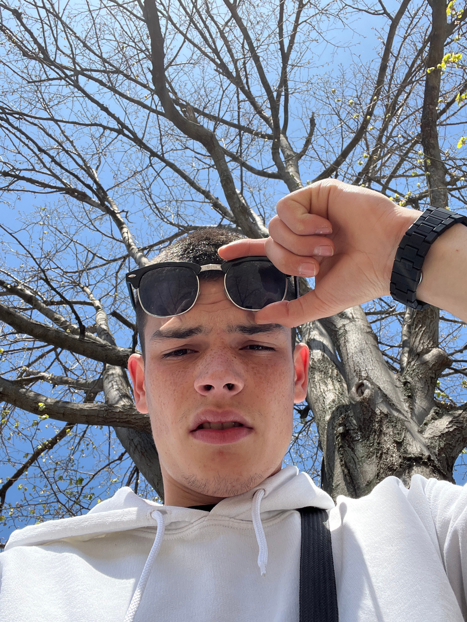 A low-angle, close-up photograph captures a young man outdoors against a clear blue sky and a tree with budding branches. The image is rotated 90 degrees counter-clockwise, showing the man upside down…read more