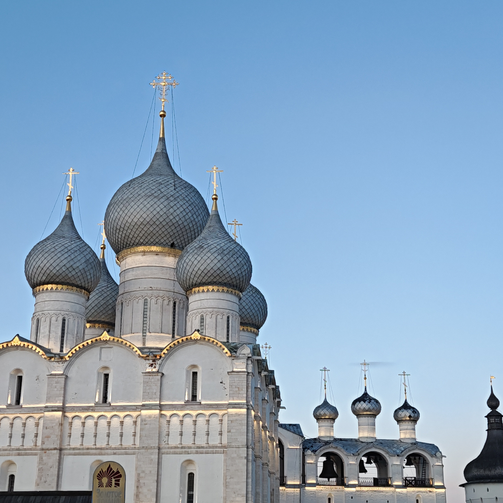 The image shows a partial view of the Rostov Kremlin in Rostov, Russia, under a clear blue sky. The architecture is distinctly Russian Orthodox, featuring white stone buildings with gray, onion-shaped…read more