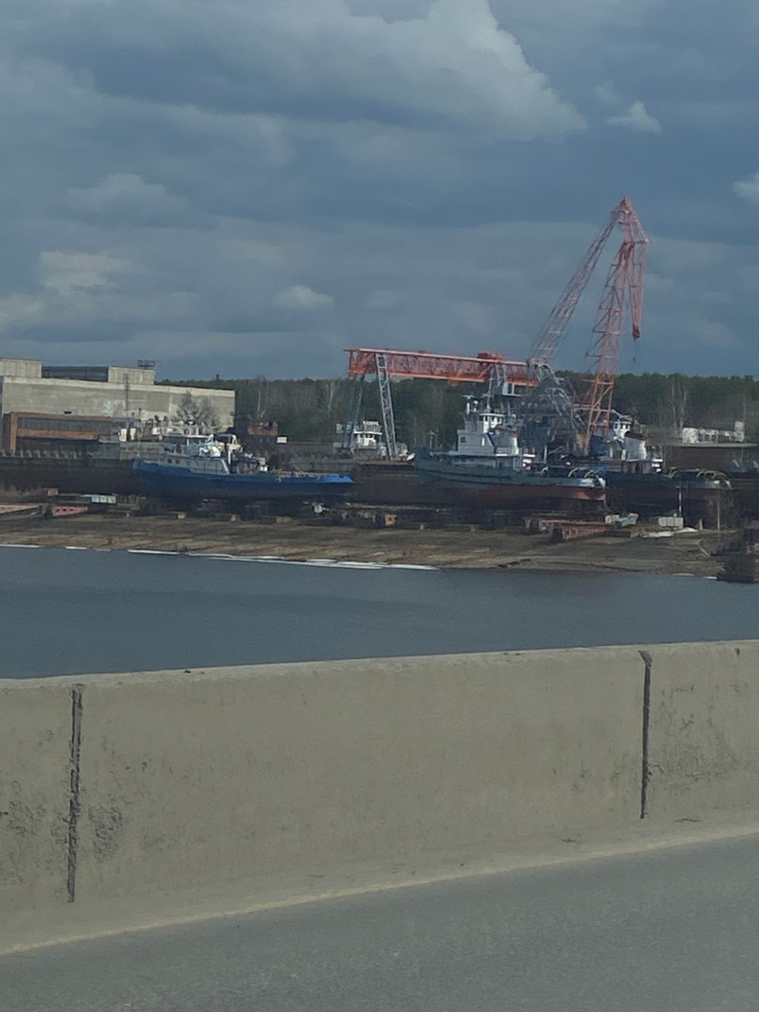 The image shows a crane in what appears to be an industrial or construction site. In the background are several buildings, possibly part of a factory or storage facility. The sky is overcast with heav…read more