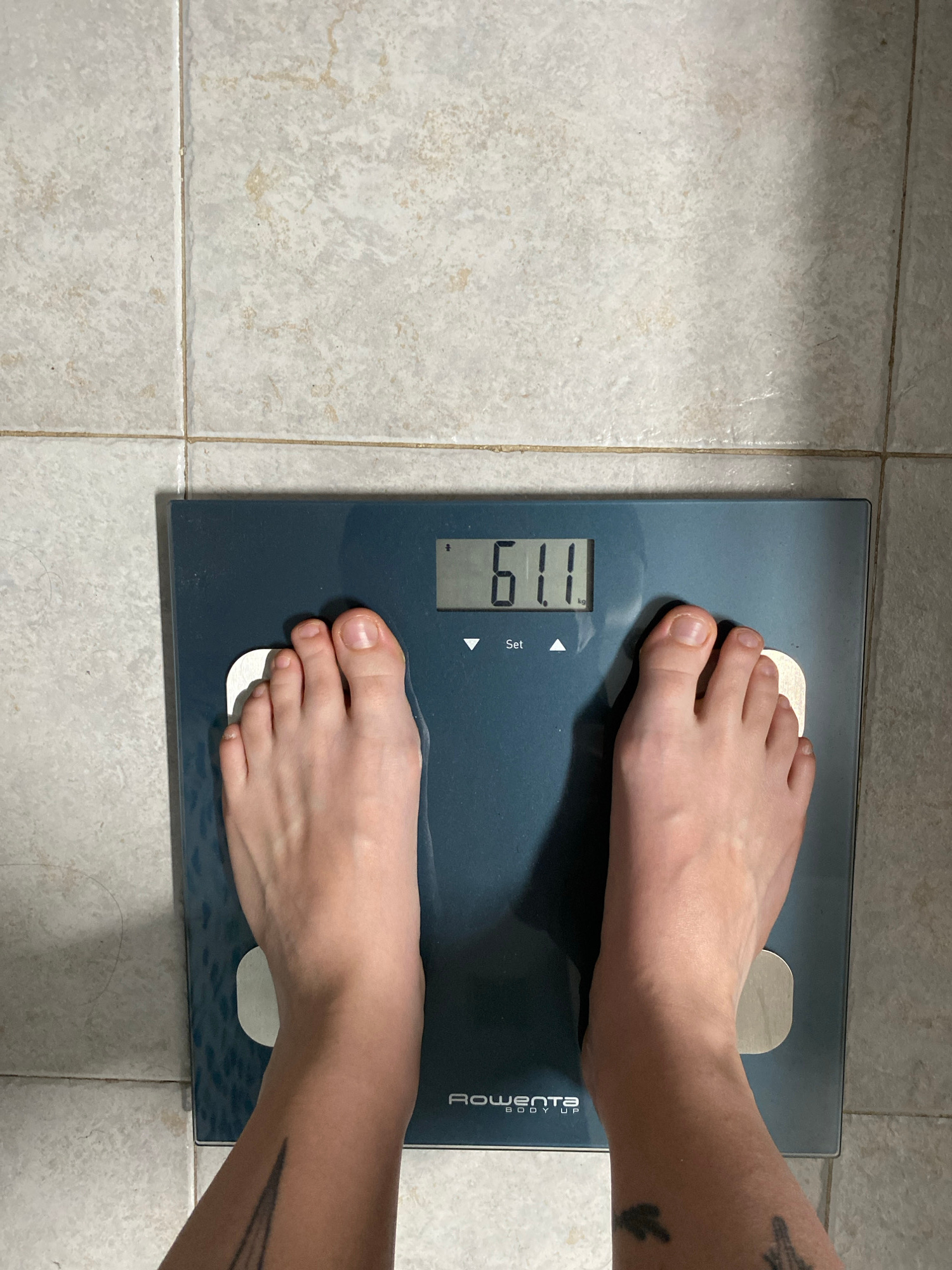 A person's feet are standing on a dark blue Rowenta Body Up scale displaying a weight of 61.1 kg. The scale is positioned on a beige tiled floor. Part of the person's legs are visible, revealing tatto…read more