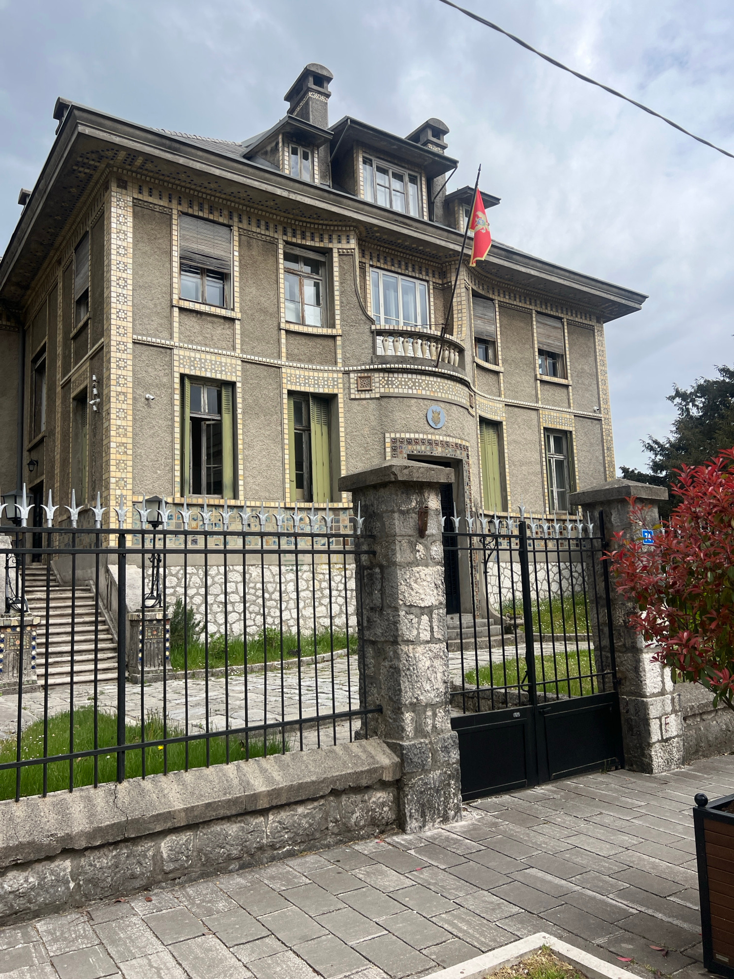A photograph depicts a building in Cetinje, Montenegro. The structure is a multi-story building with a grayish-tan facade, decorated with rows of tiles. Windows are visible on each level. The flag ofโฆread more