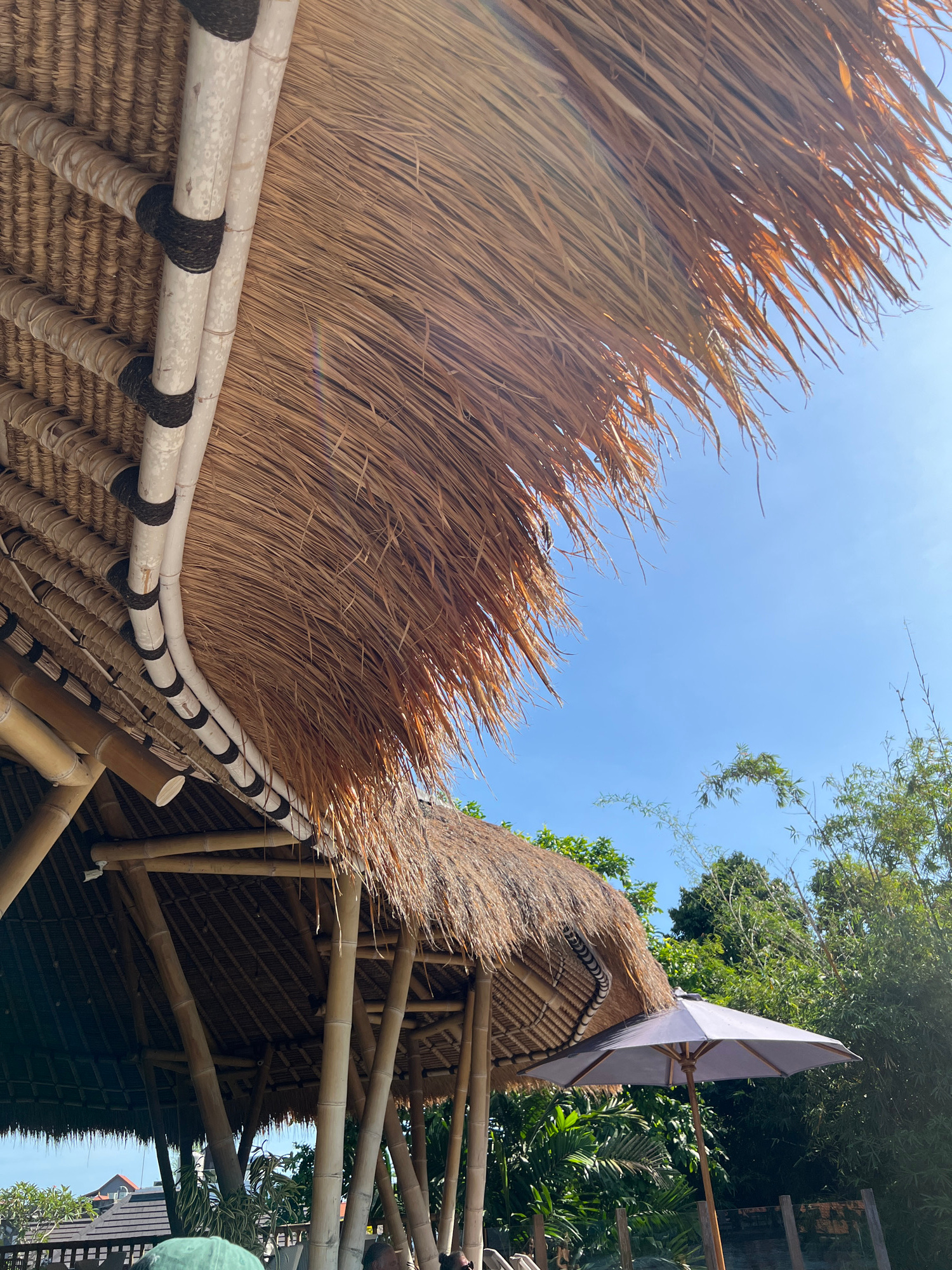 The image shows a section of a traditional thatched roof structure, likely a building or shelter, against a clear blue sky. The roof is constructed with a bamboo frame and covered in dried grasses orβ¦read more